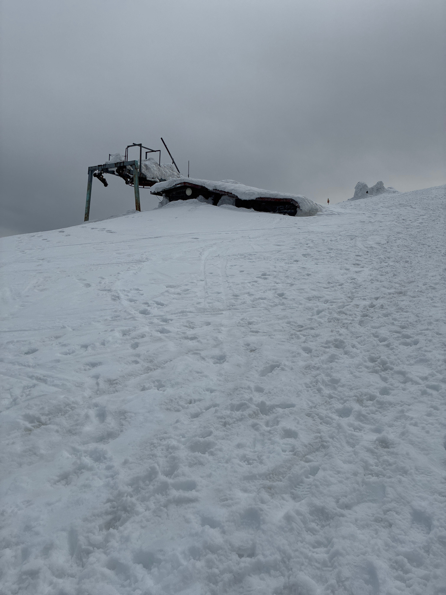 The image shows a snow-covered landscape in Bistritsa, Bulgaria. A metal structure, possibly part of a ski lift, stands against a steep, snow-covered incline. The sky is overcast. There is no evidence…read more