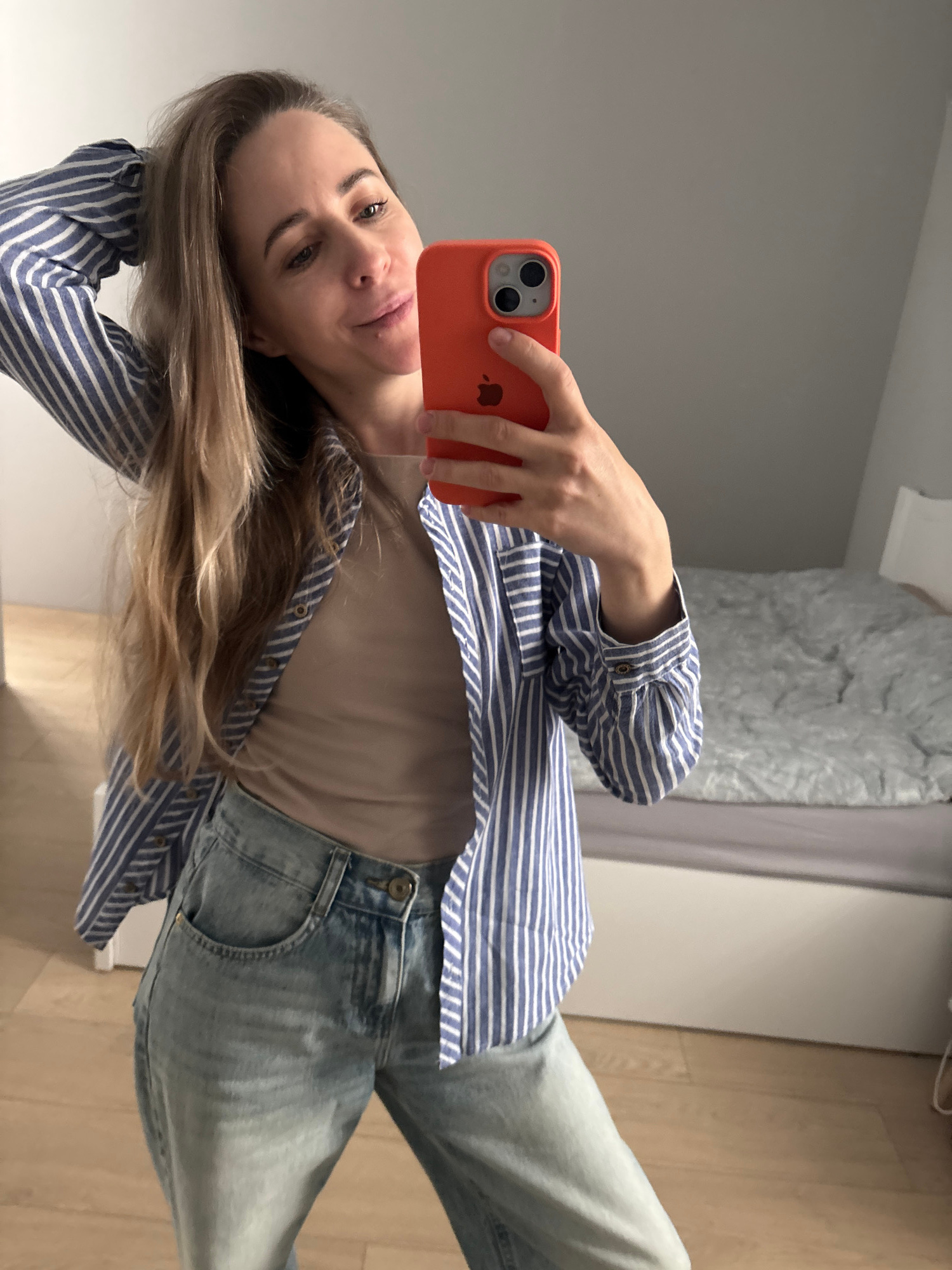 A woman is taking a selfie in what appears to be an indoor environment, possibly a bedroom. She is holding an orange iPhone in her right hand, capturing her image in a mirror. She is wearing a blue and white striped long-sleeved shirt, which is unbuttoned revealing a beige undershirt. She is also wearing light blue jeans. Her long blonde hair falls across her shoulder and towards the camera. In the background, a bed with grey bedding is visible, along with a light-colored wall and what appears to be a wooden floor. The photo does not contain enough information to determine if the location is Chaikovsky, Russia. | Open Wire