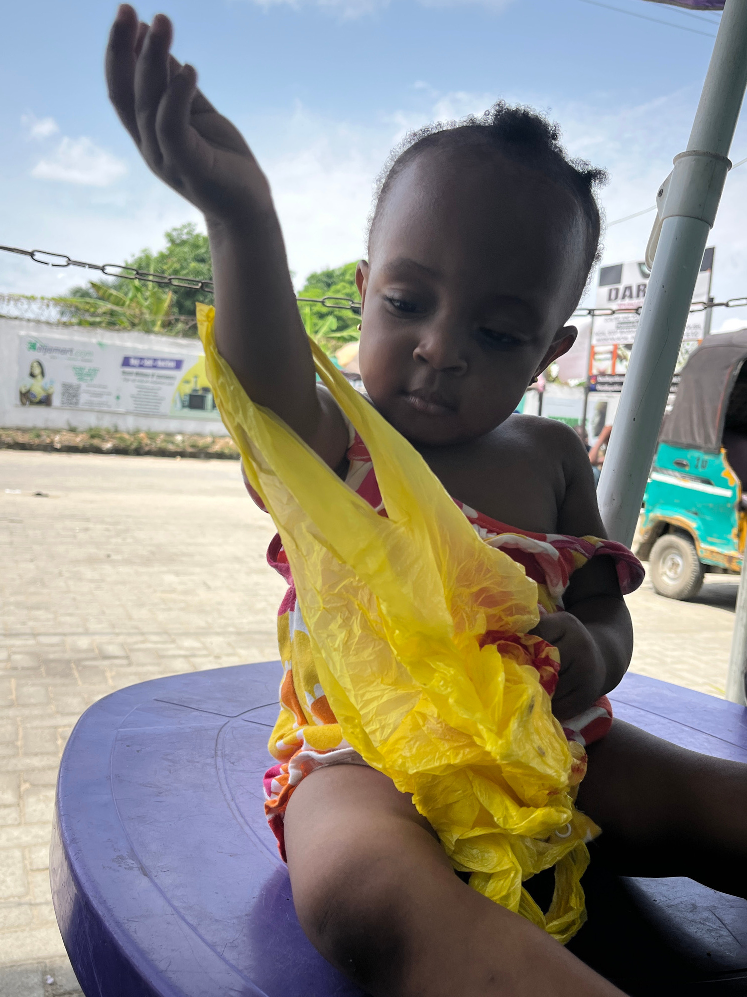 A child sits on a purple plastic stool. The child holds a bunch of yellow plastic bags. The location is Lekki, Nigeria, as evidenced by a sign in the background that reads "Mart.com.ng" and other deta…read more