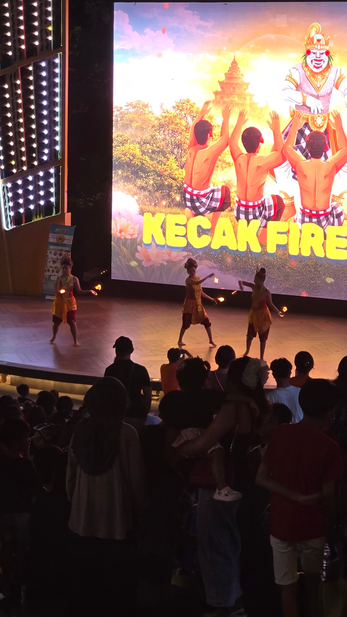 This image captures a vibrant cultural performance, likely a Kecak Fire dance show, taking place in Denpasar, Indonesia. The setting appears to be an evening event indoors or in a darkened outdoor ven…read more