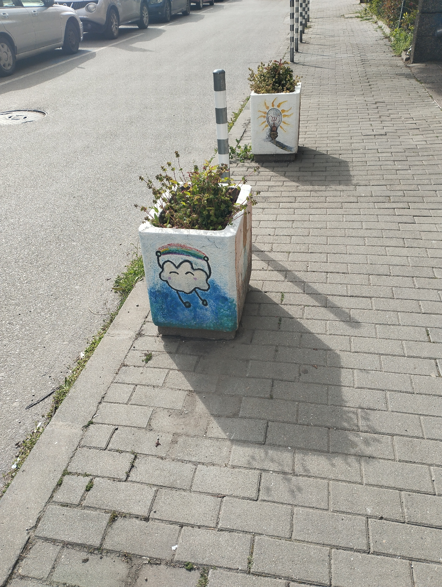 The image shows two square, painted concrete planters with vegetation in them. They are located on a brick paved sidewalk next to an asphalt road. The first planter features a cartoon-like cloud with…read more