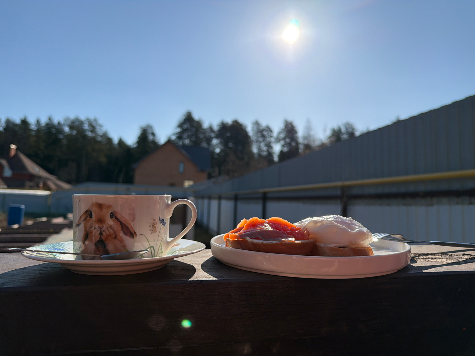 A bright and tranquil outdoor breakfast scene is depicted, likely taking place in Chaikovsky, Russia. In the foreground, a white ceramic teacup featuring a whimsical design of a lop-eared rabbit coverβ¦read more