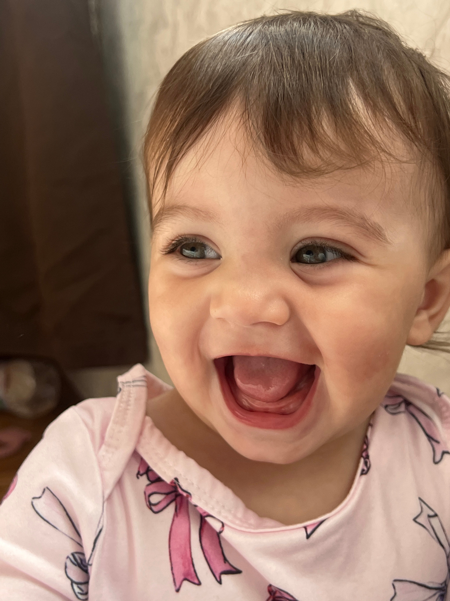 A close-up, tilted, indoor shot depicts a smiling baby girl with brown hair and grey-green eyes. Her mouth is open, revealing her tongue. She is wearing a pink pajama top with a ribbon pattern. A dark…read more
