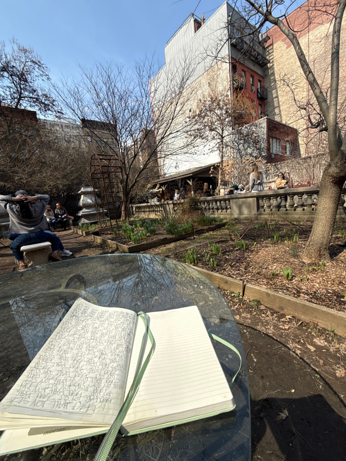 The image depicts an urban community garden or park in New York City, United States of America, under clear daylight, indicating late winter or early spring. In the immediate foreground, an open jour…read more