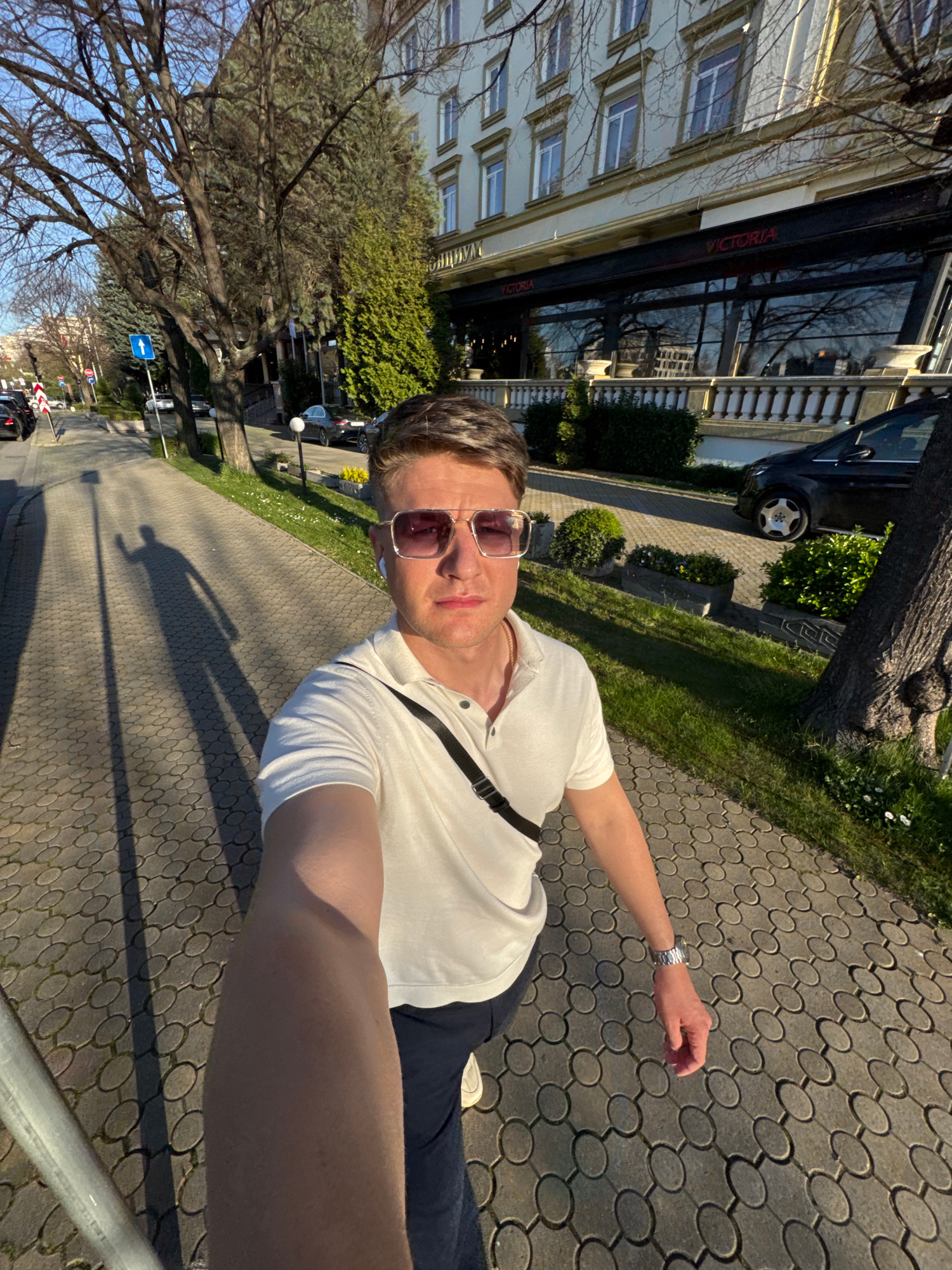 The image depicts a man taking a selfie while standing on a cobblestone sidewalk. He is wearing sunglasses, a light-colored polo shirt, and dark pants. A strap crosses his chest. The sidewalk runs alo…read more