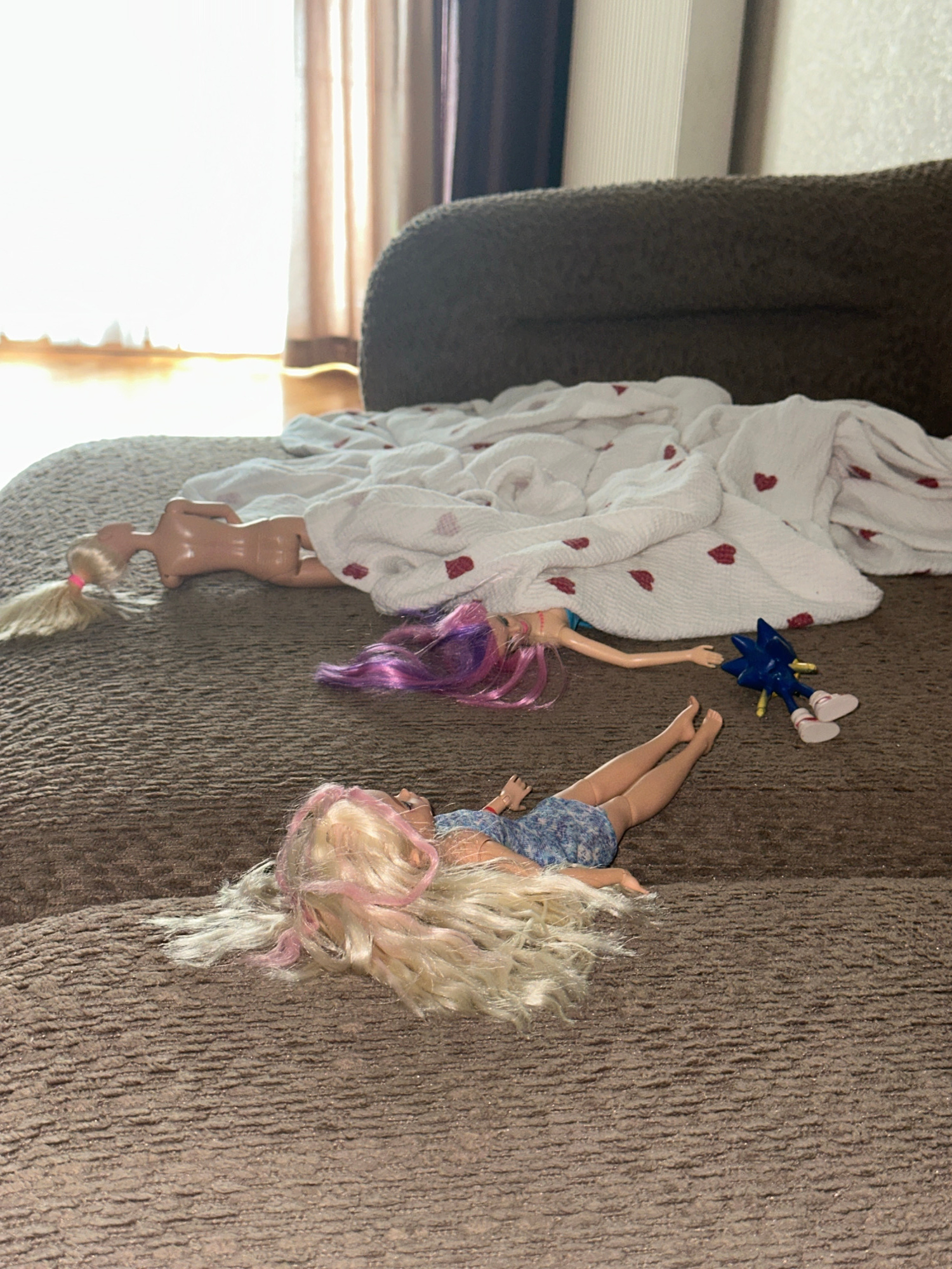 The image depicts a scene on a brown textured surface, likely a couch. Several dolls are present: two full dolls and two doll torsos. One doll is covered with a white blanket decorated with red hearts…read more