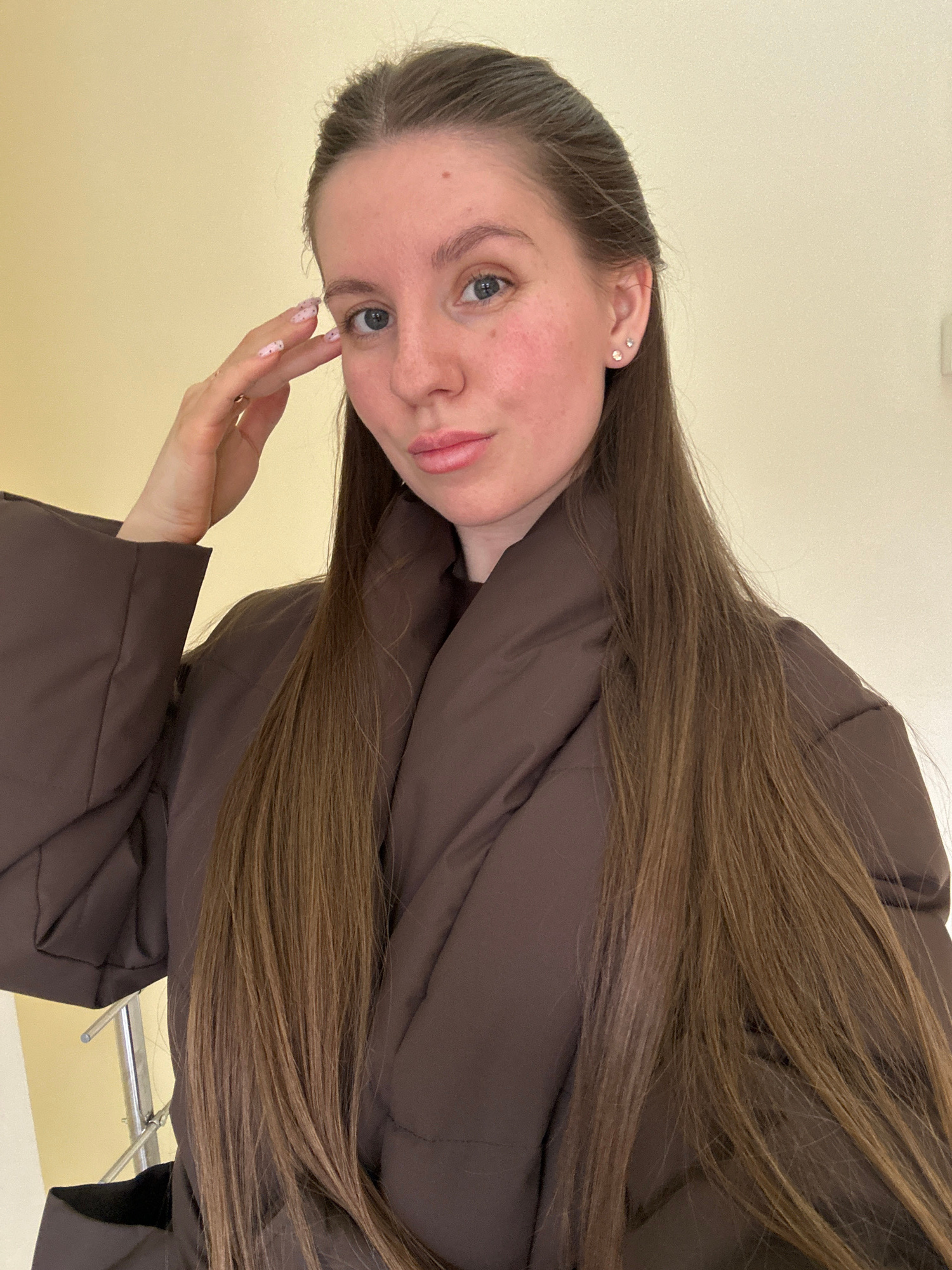 A young woman with fair skin, light brown hair, and blue eyes poses indoors, wearing a brown puffy jacket. She is looking directly at the camera with a slight smile. Her left hand is raised near her f…read more