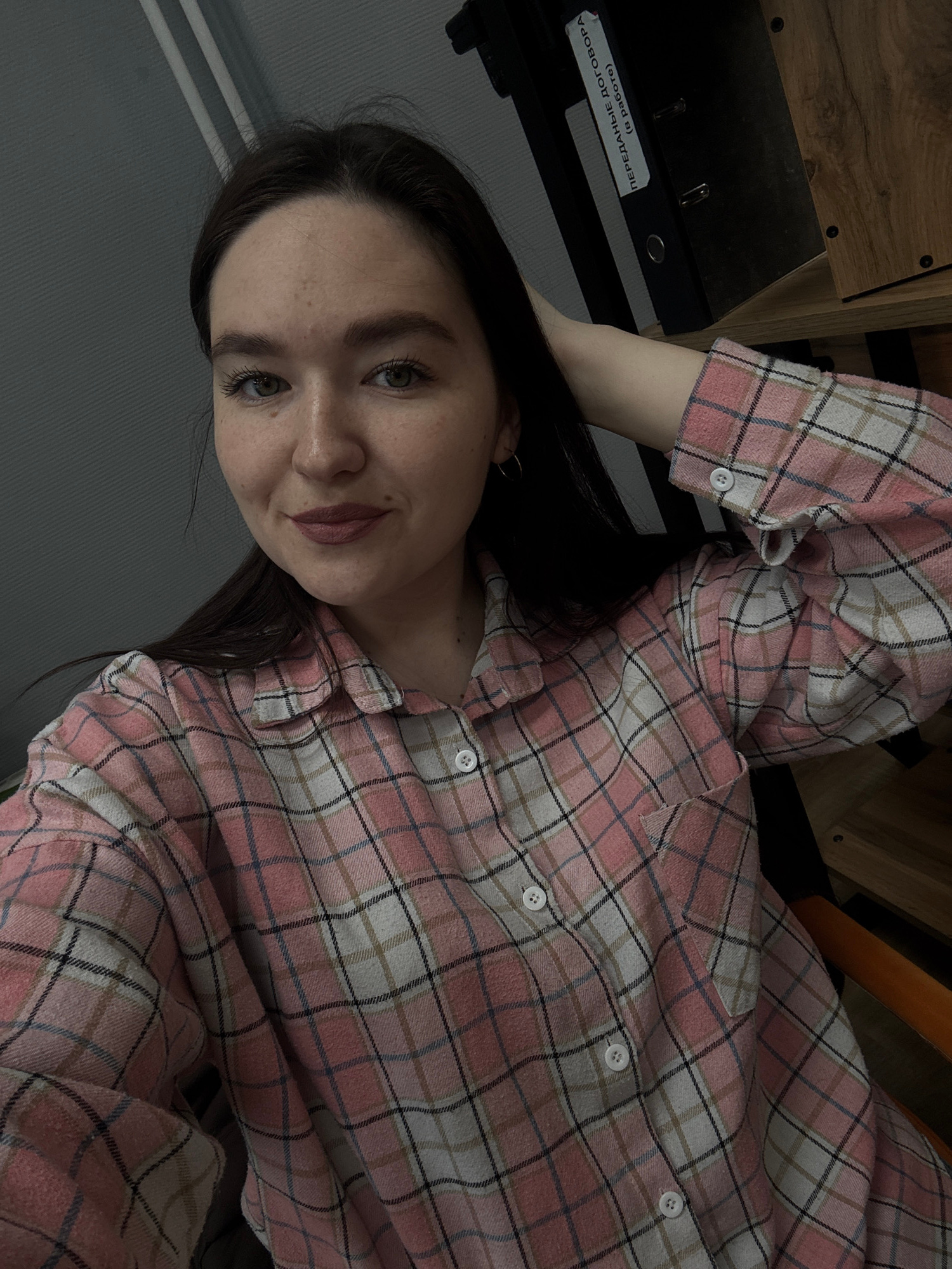 A young woman is depicted indoors, likely in Chaikovsky, Russia, based on the Russian text on a black binder labeled "ПЕРЕДАЧНЫЕ ДОГОВОРА (в работе)". She is wearing a pink and white plaid shirt. The…read more