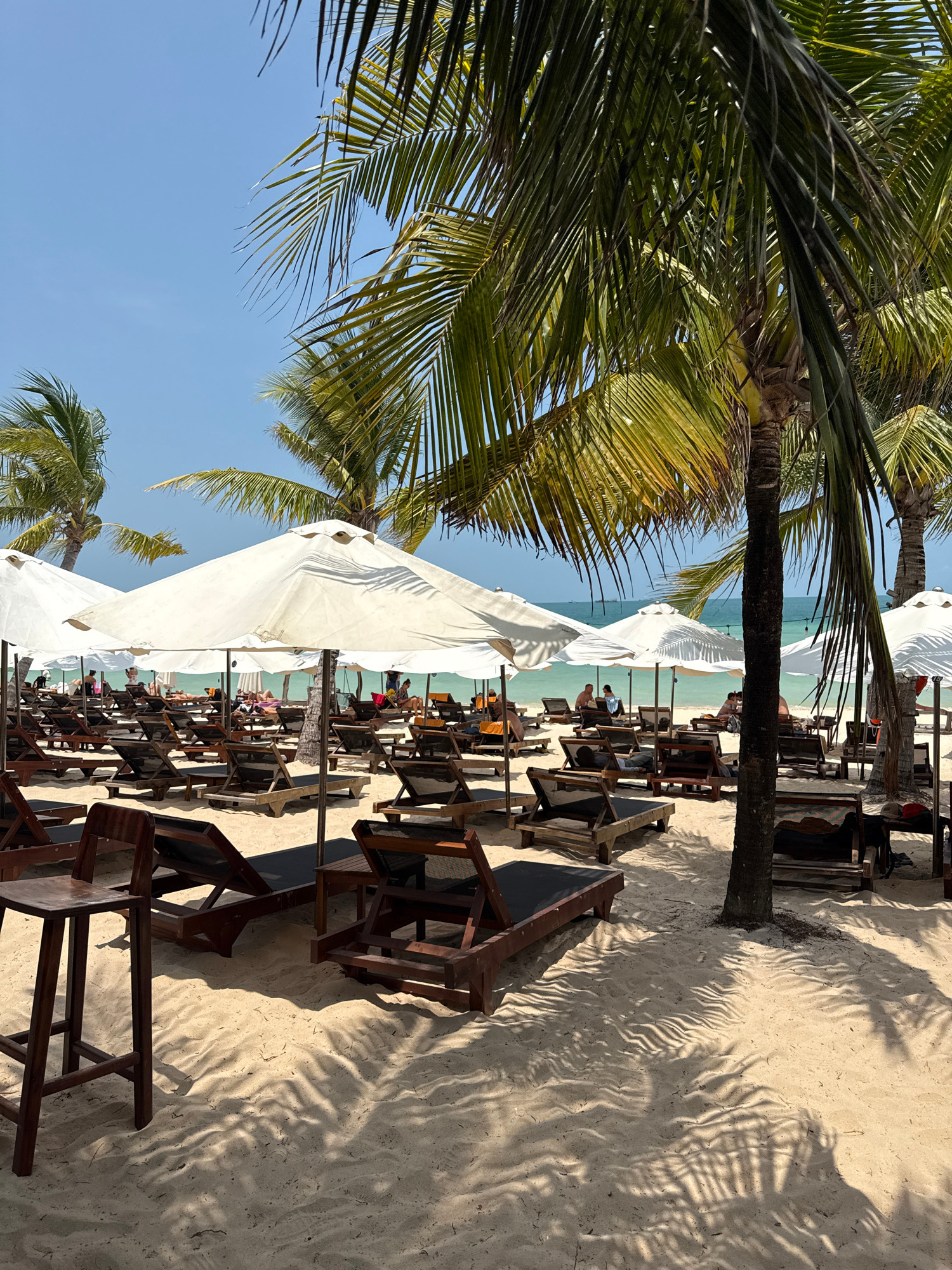 The image captures a sunny, tranquil beach scene in Phú Quốc, Vietnam, viewed from beneath palm trees. On the left side, the lush green fronds and sturdy brown trunks of several palm trees dominate th…read more