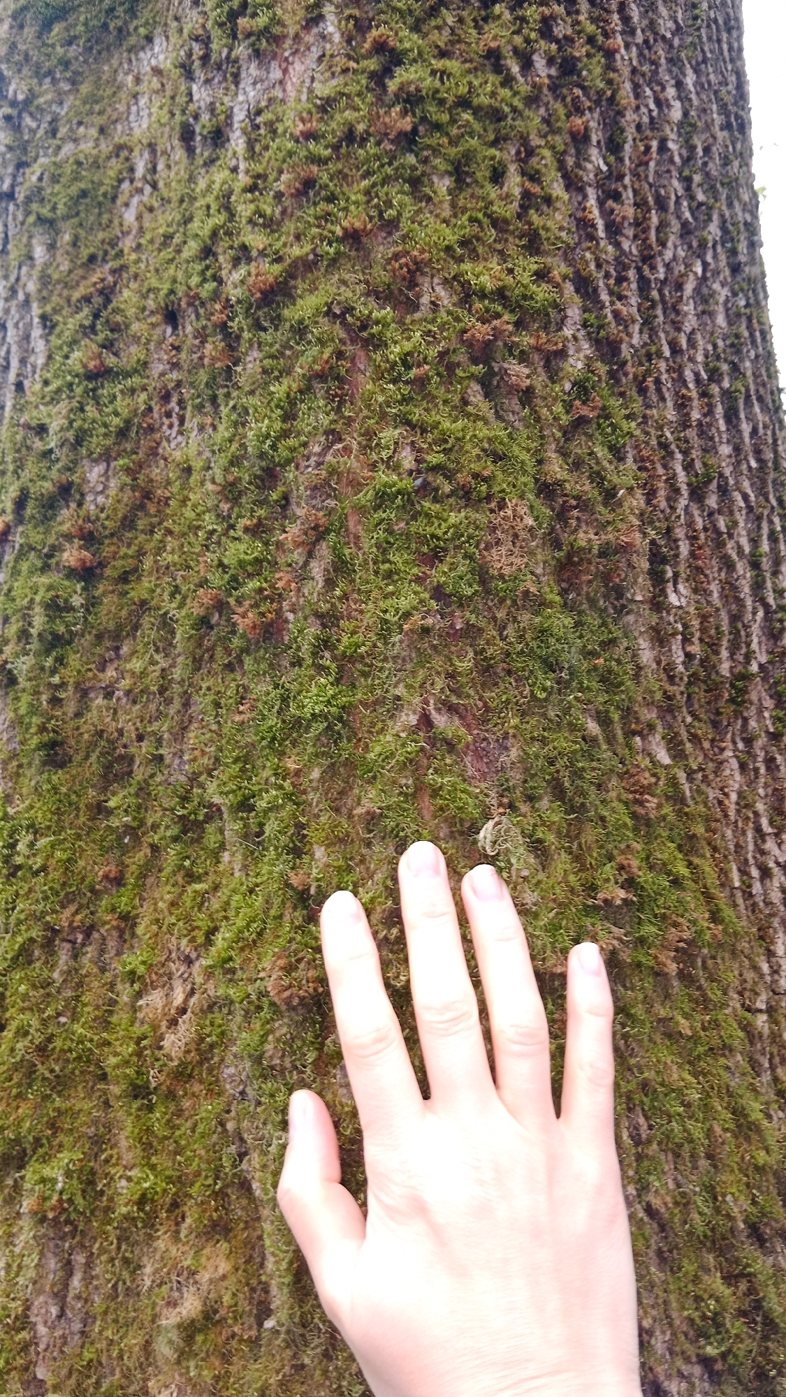 A close-up shot depicts a tree trunk densely covered in green moss. A Caucasian hand rests against the mossy trunk, with fingers extended. The bark of the tree is visible beneath the moss. The locatio…read more