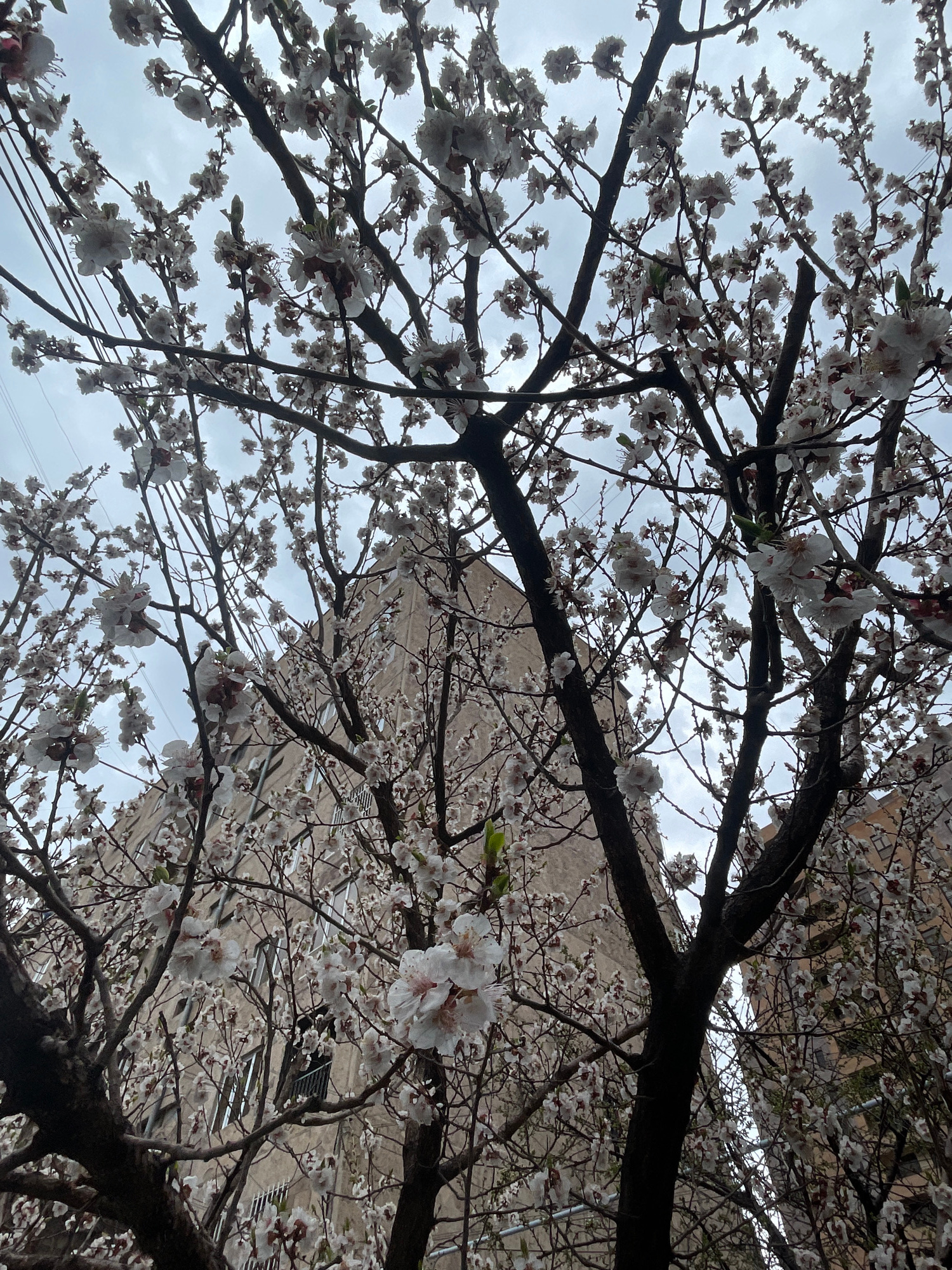 A low-angle shot depicts a tree in full bloom with white flowers against an overcast sky. The branches are dark and bare except for the flowers. In the background, a light-colored building is partiall…read more