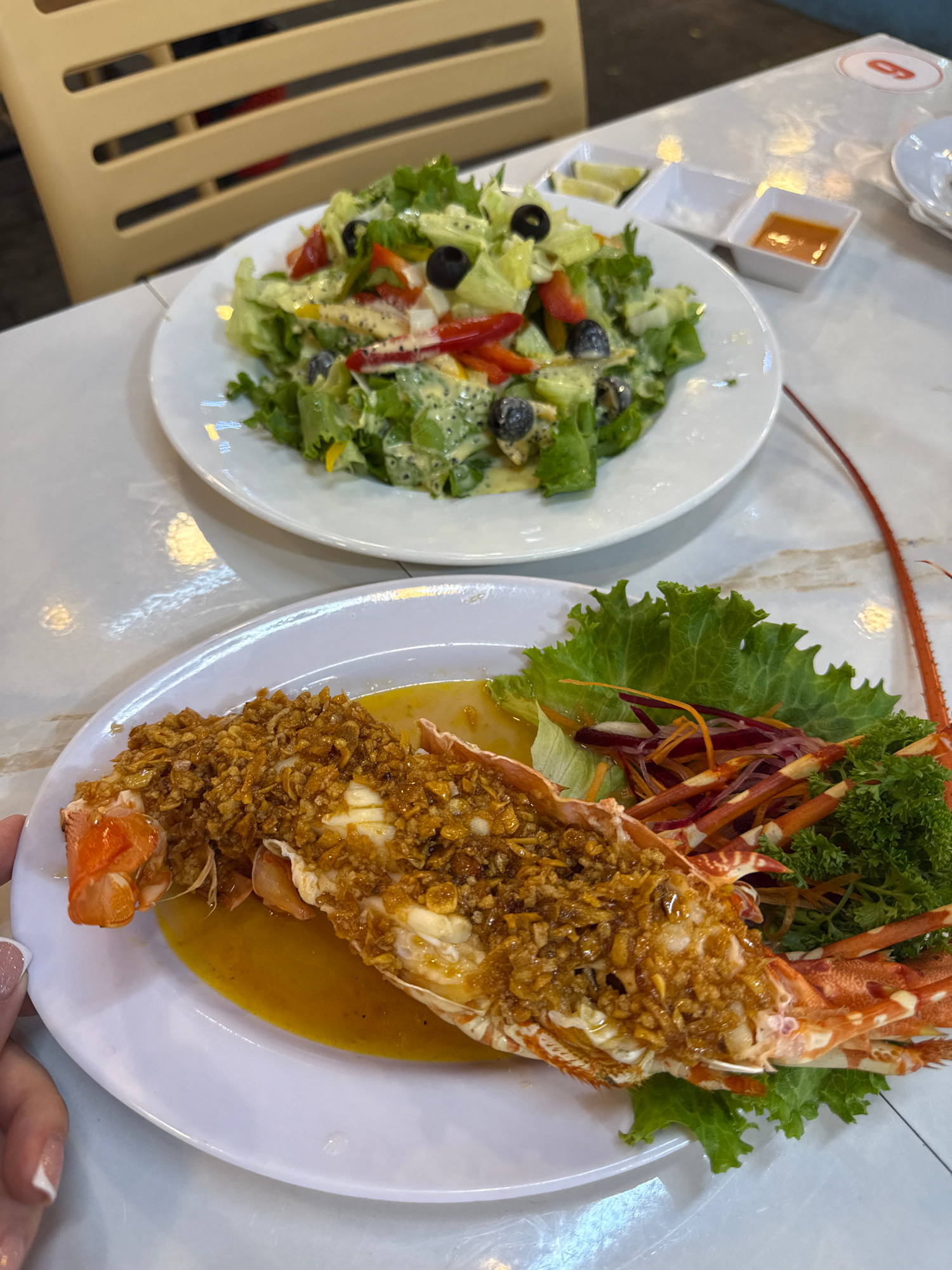 The image displays an overhead view of a dining table set with two plates of food and condiments, captured in a restaurant setting in Phú Quốc, Vietnam. The dominant feature is a large, halved lobste…read more