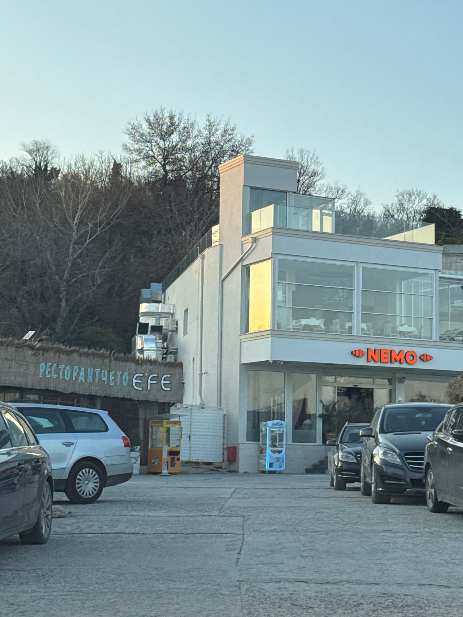 The image depicts a street scene in Varna, Bulgaria. The focus is on a two-story building housing a restaurant named "NEMO". The restaurant has large glass windows. Next to it, a sign reads "РЕСТОРАНТ…read more