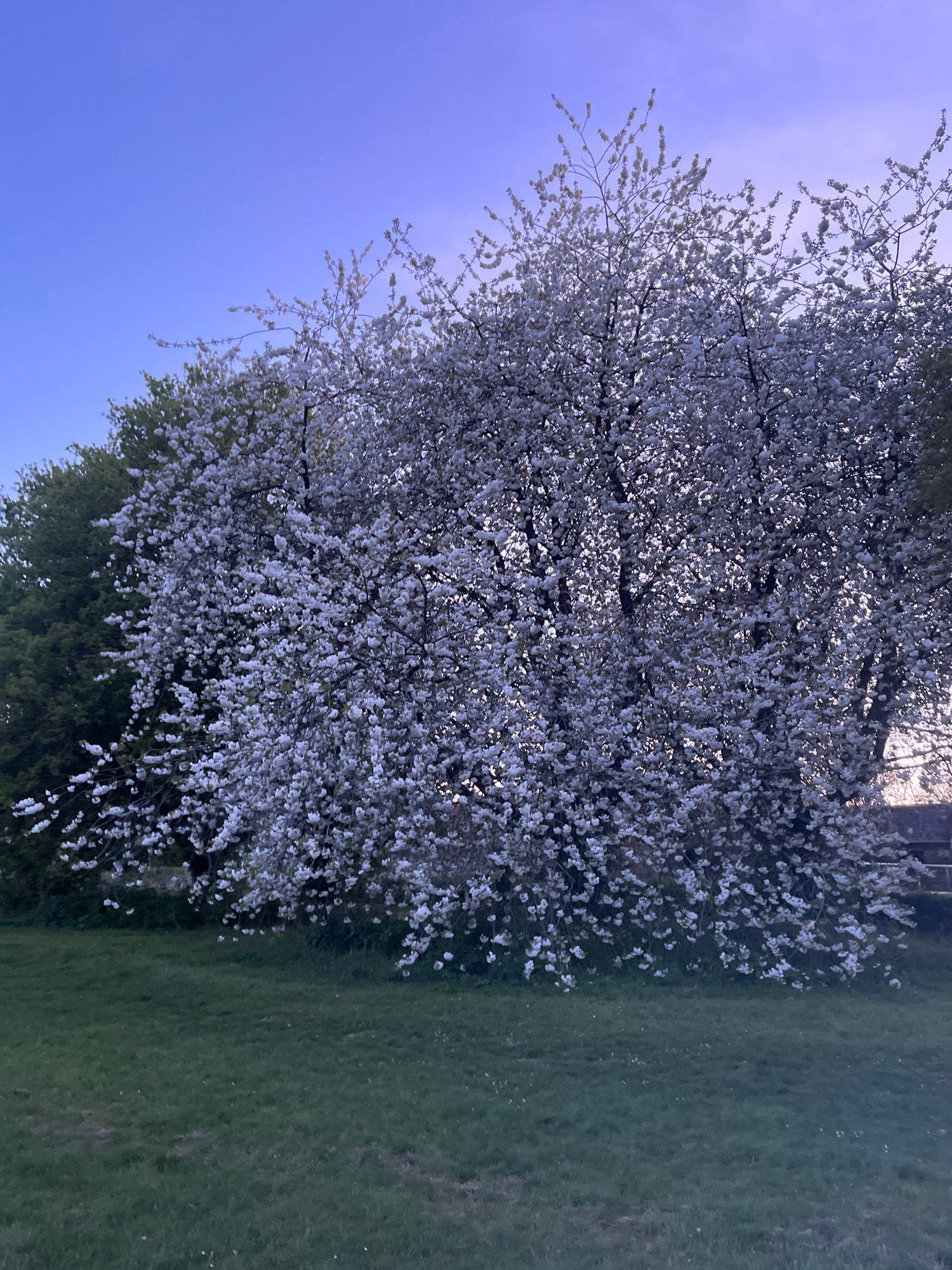 The image shows a tree heavily laden with white blossoms in Maidstone, United Kingdom. The tree is positioned to the left of a grassy field, and the sky is visible behind the tree with a clear blue gr…read more
