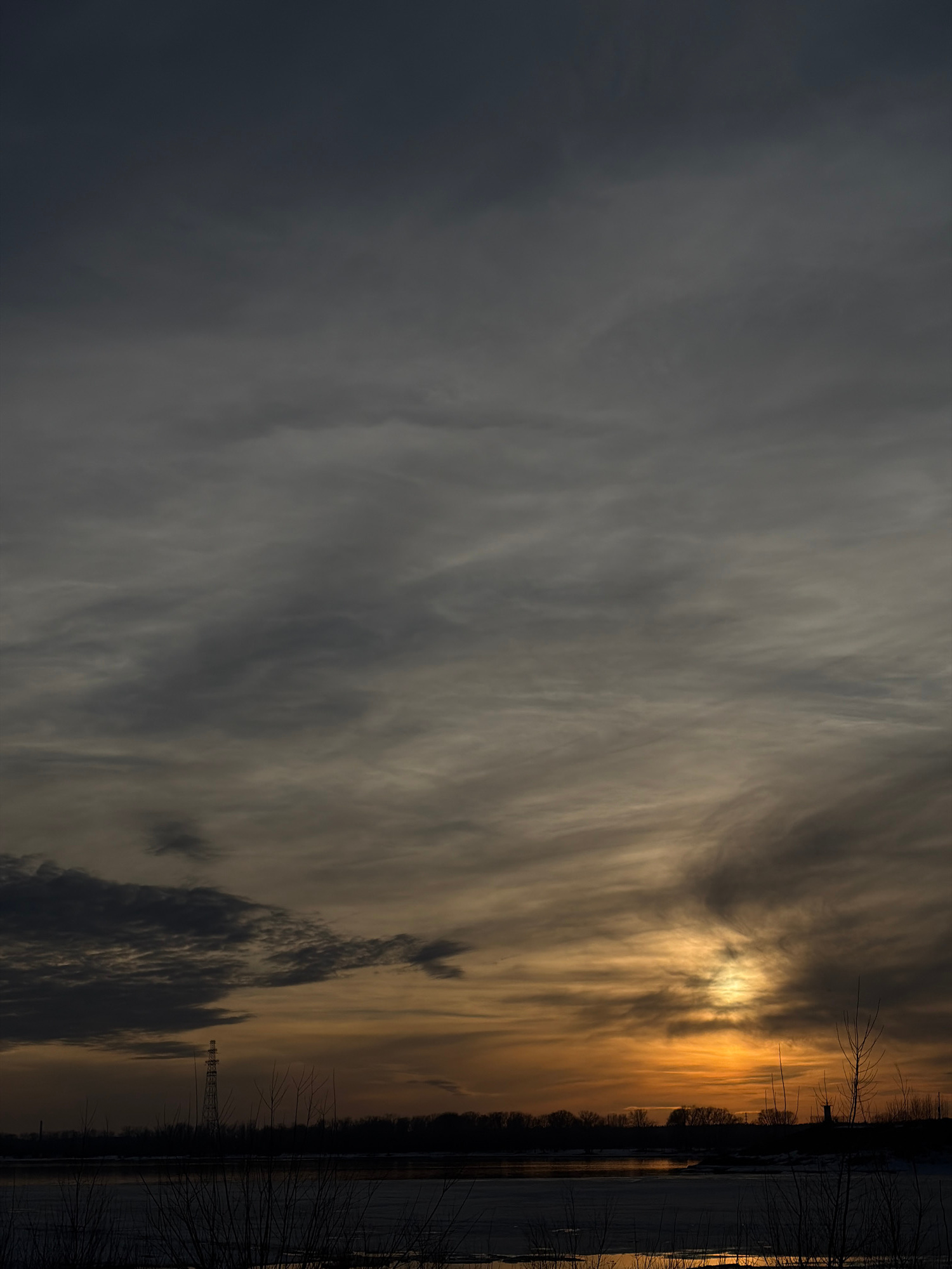 The image captures a twilight landscape in Chaikovsky, Russia. The sky, occupying the majority of the frame, is overcast with layers of dark grey and lighter grey clouds. Towards the lower right, the…read more