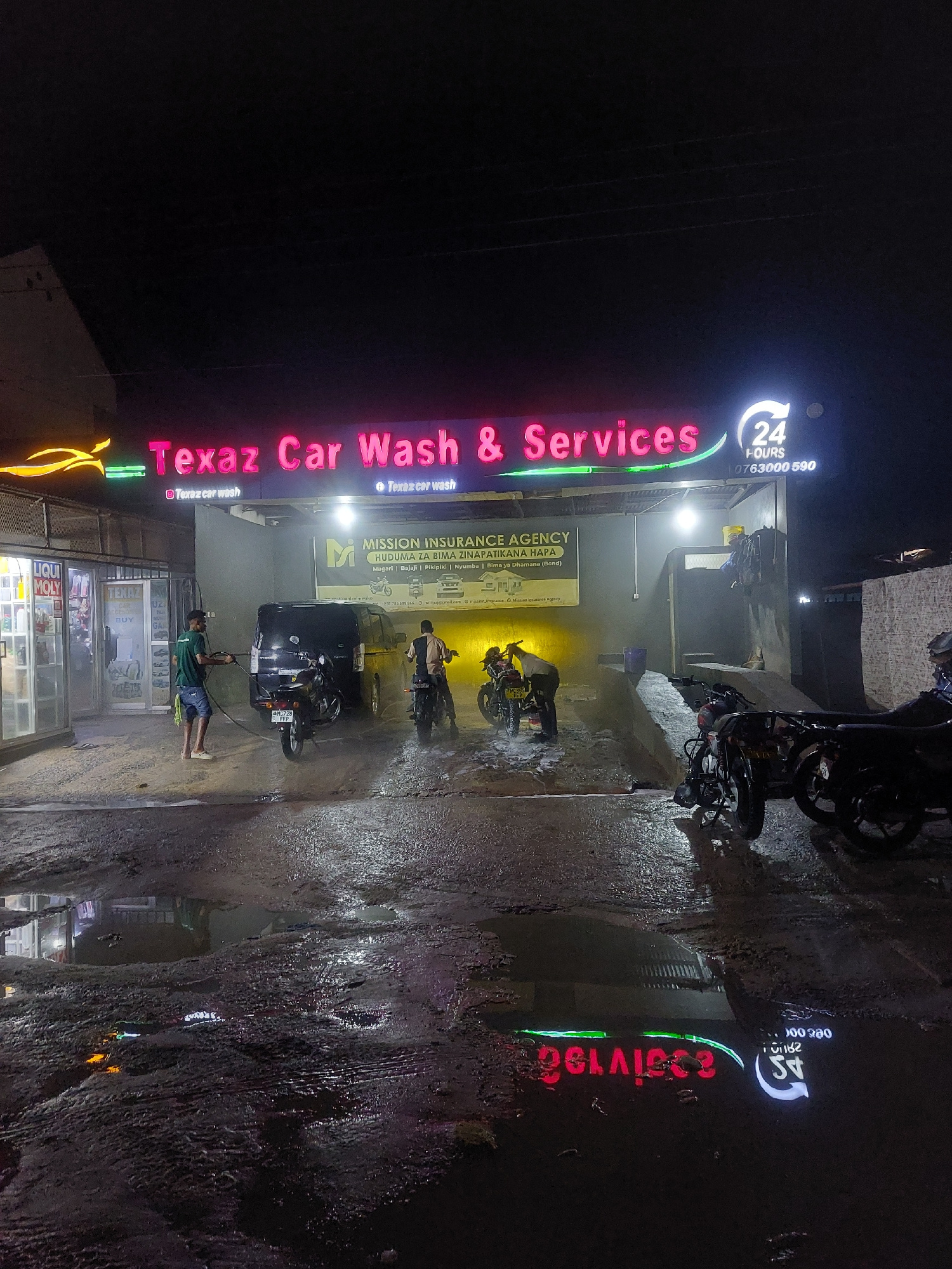 The image shows a car wash business at night in Dar es-Salaam, Tanzania, called "Texaz Car Wash & Services." The name is displayed in pink neon, next to a yellow car logo. There's a "24 hours" sign ab…read more