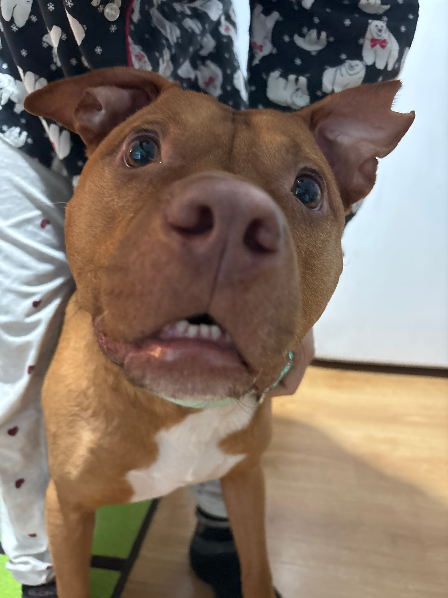 A close-up, slightly tilted shot focuses on a light brown dog with white markings on its chest and a green collar. The dog is looking directly at the camera with a curious expression, mouth slightly o…read more