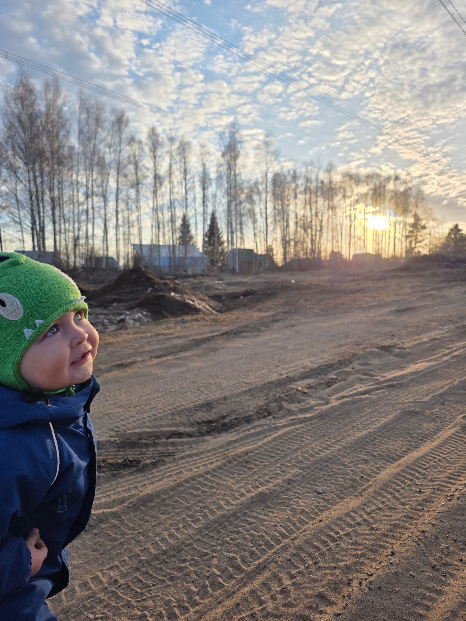 A child wearing a green hat and a blue jacket lies on the ground. The ground is sandy with tire tracks. In the background, there is a line of trees and a sky with clouds and the sun. The location is N…read more