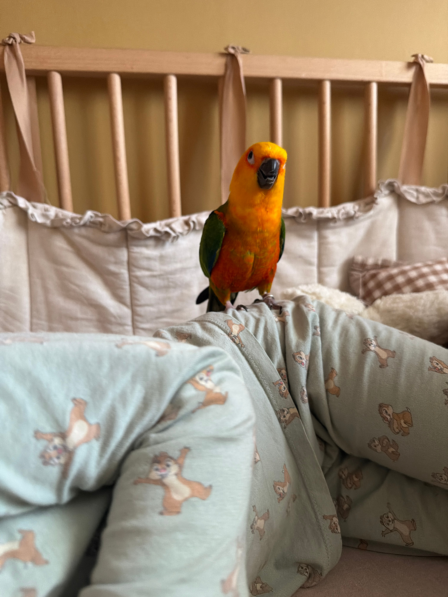 A close-up, medium-shot image shows a sun conure parrot perched on a person's arm. The person is wearing light blue pajamas with a brown cartoon animal print. The parrot's head is yellow, and its body…read more