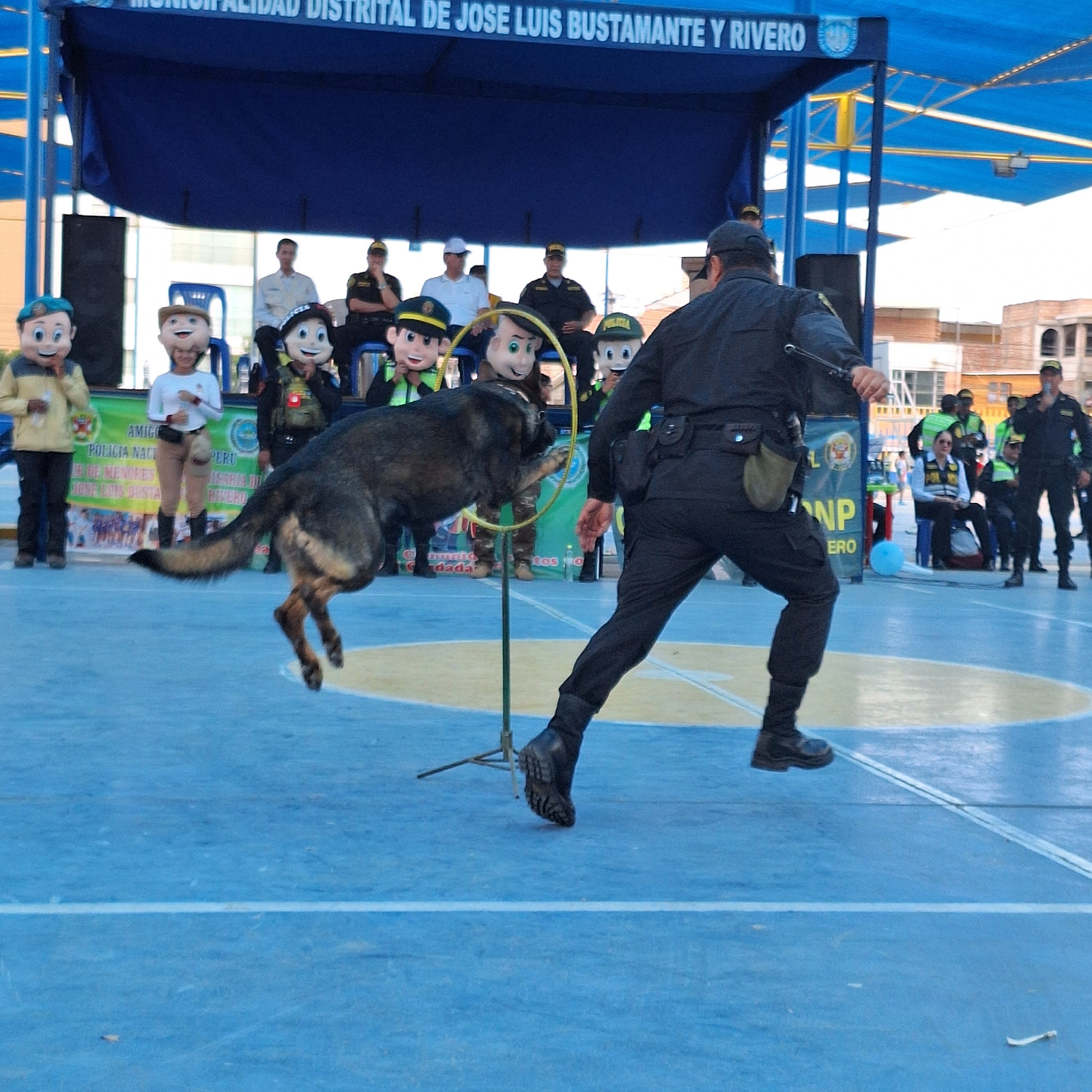 On a blue basketball court in the city of José Luis Bustamante y Rivero, Peru, a police officer in black uniform guides a dog jumping through a hoop. Behind them are several people wearing police offi…read more