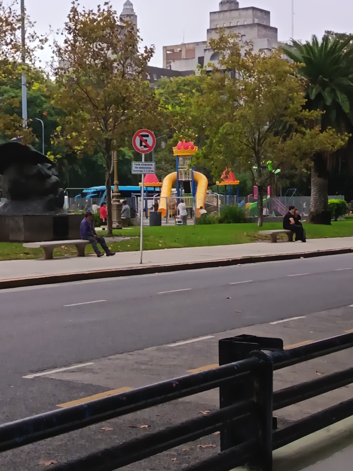 The image shows a street scene in Buenos Aires, Argentina. A wide, paved road separates the foreground from a park area in the background. In the foreground, a black metal railing is partially visible…read more