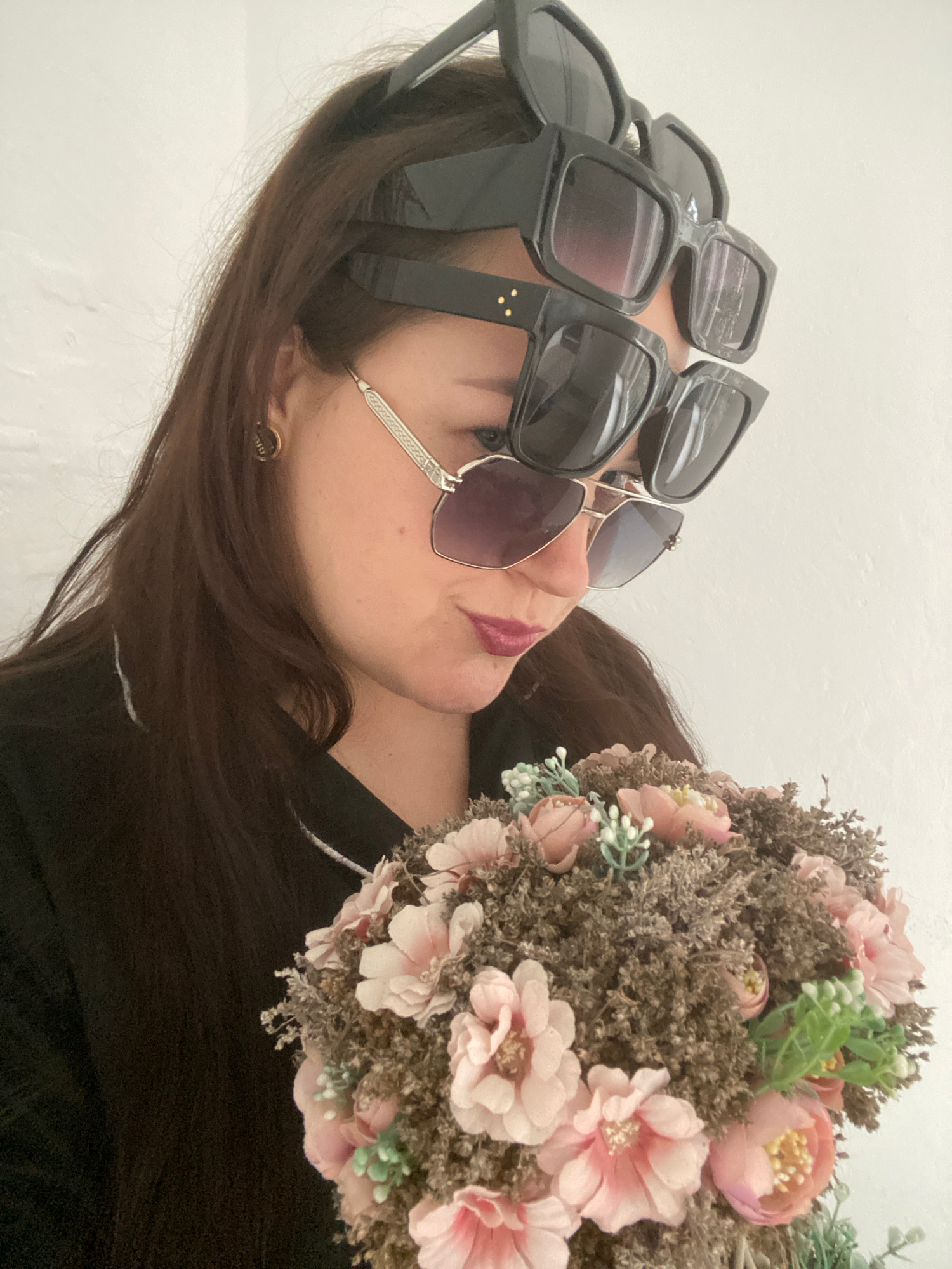 A woman is lying down, wearing multiple pairs of sunglasses stacked on her head. She is holding a bouquet of pink flowers. The background is a white wall. There is no discernible information to indica…read more