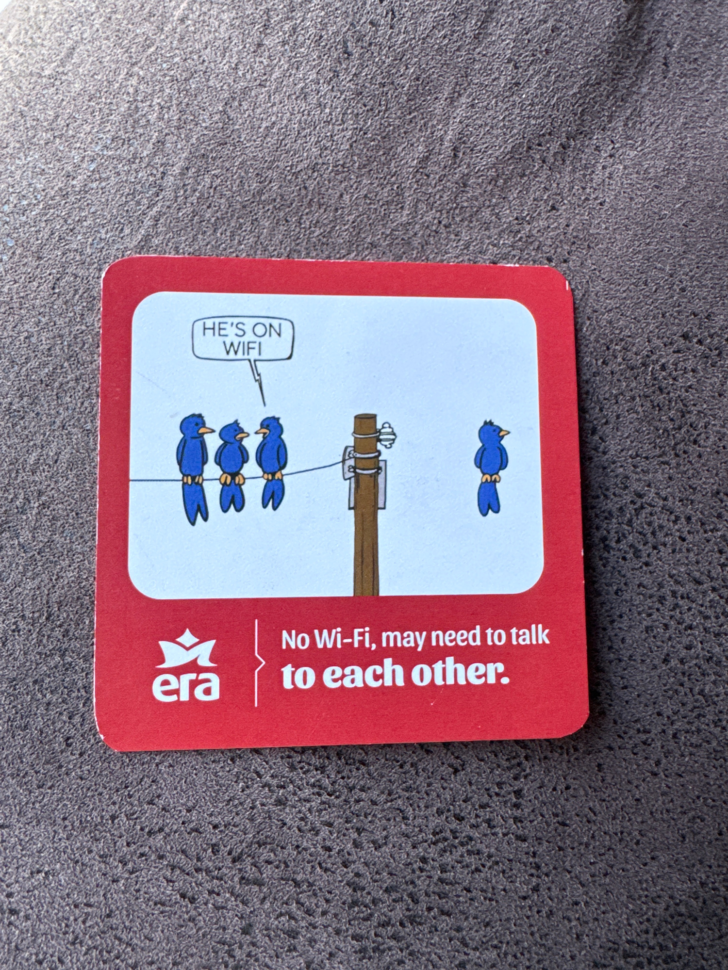 The image shows a red and white ERA Realty business card with a cartoon. The cartoon depicts a wooden telephone pole with four blue birds. Three of the birds are sitting on the wire connected to the p…read more