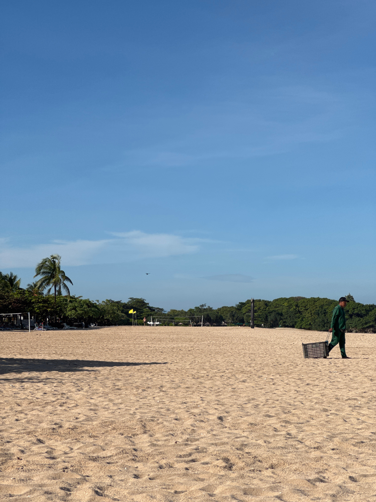 The image depicts a beach in Kuta Selatan, Indonesia on a sunny day. The sky is clear blue with wisps of clouds. The foreground features a sandy beach. A person dressed in green uniform is present at…read more