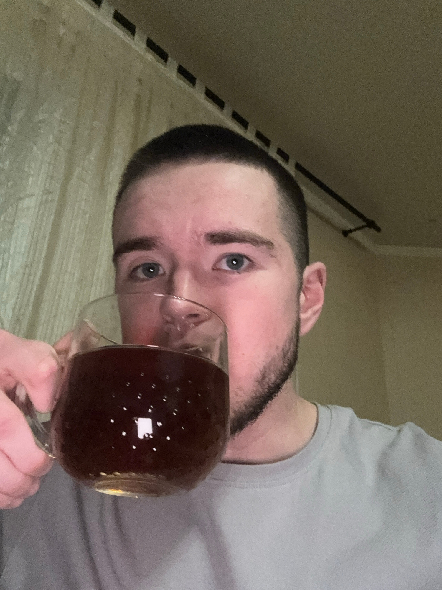 A man is holding a glass of dark liquid, possibly coffee or tea. He has short dark hair and light-colored eyes. He is wearing a light grey t-shirt. The background is out of focus but appears to be a r…read more