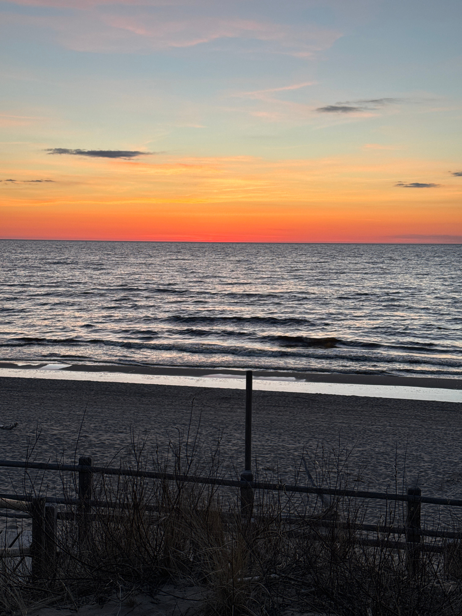 The image depicts a beach landscape at sunset, likely near Carnikava, Latvia. The left side shows a vibrant sky with orange, yellow, and blue hues and some dark clouds. Adjacent to the sky is a view o…read more
