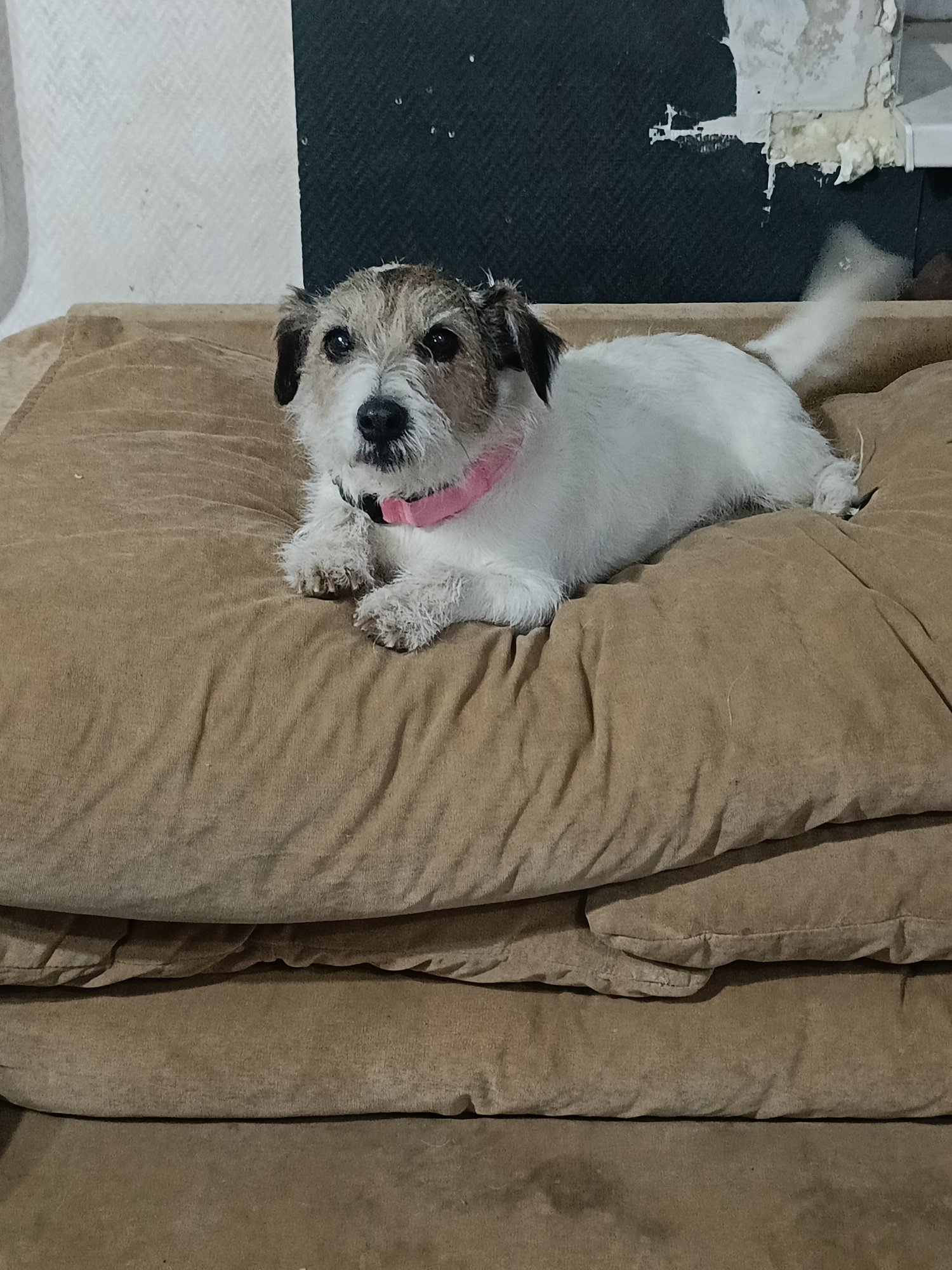 A medium-sized, white, wire-haired terrier with brown and black markings on its head and ears is lying on a brown, suede-like cushion of a sofa or bed. The dog is wearing a pink collar. The sofa or be…read more