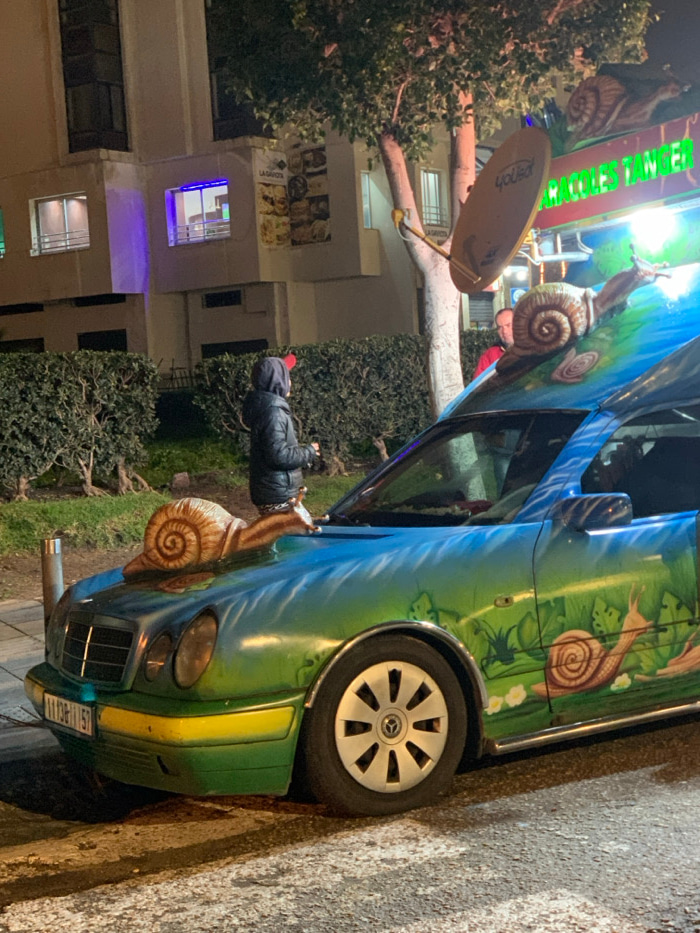 A car with snail decorations and art is parked on the side of a street at night. The car is painted green and blue with images of snails and leaves. A person wearing a black jacket and red hat is stanβ¦read more