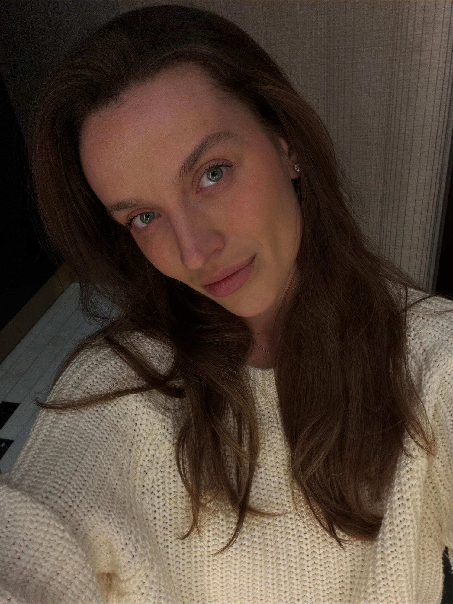 A young, fair-skinned woman with light brown hair and blue eyes is looking at the camera. She is wearing a light-colored, possibly off-white, knitted sweater. The background consists of a gray surface…read more
