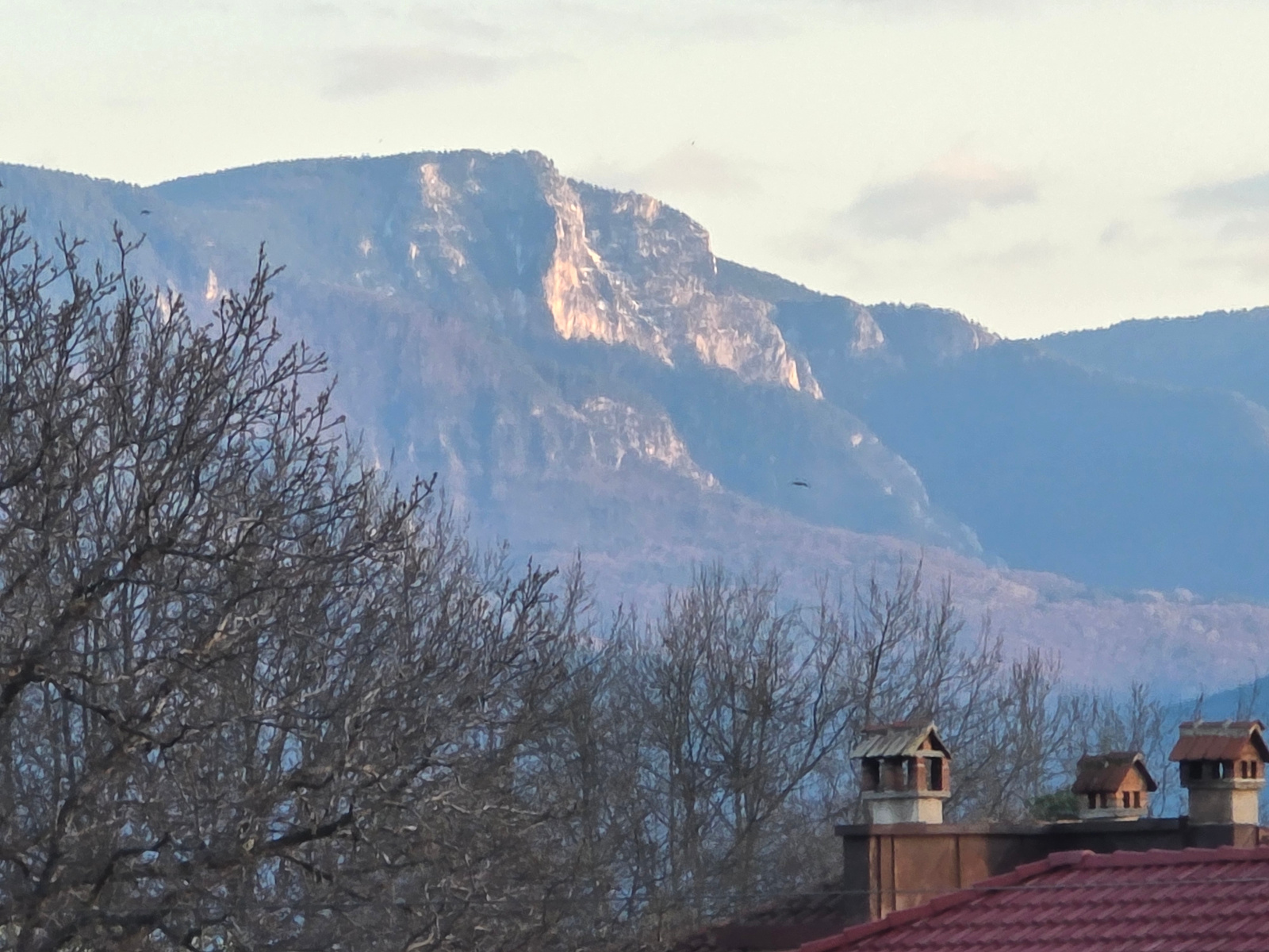 The image depicts a mountain range in the background under a hazy sky, likely taken from a vantage point within the city of Yagodovo, Bulgaria. Bare trees fill the foreground and partially obscure the…read more