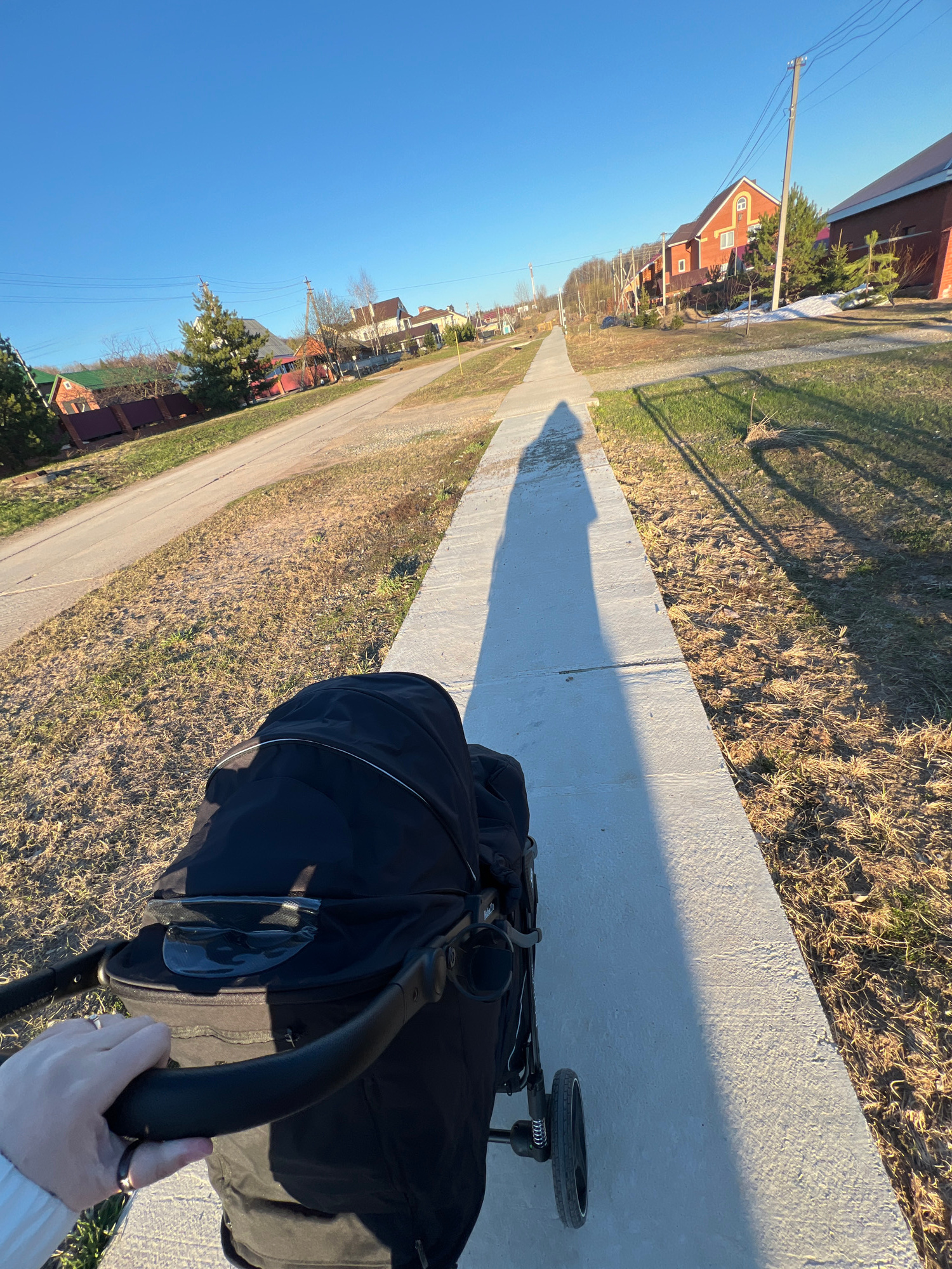 A view of Noviy, Russia, is captured from a first-person perspective behind a black stroller on a sunny day. The stroller is being pushed along a concrete sidewalk. A line of houses borders the sidewa…read more