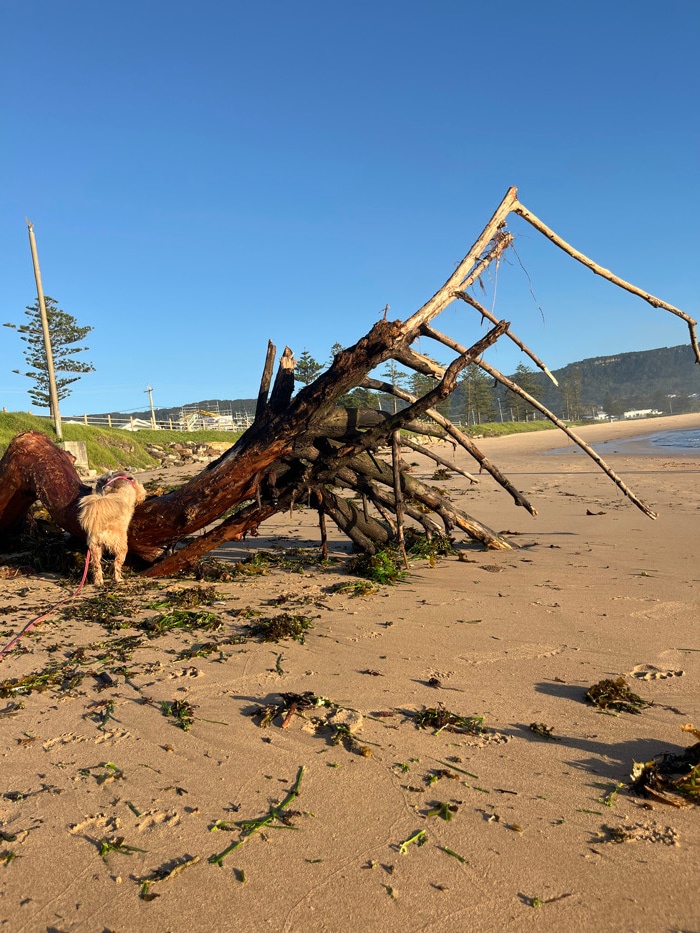 The image depicts Bulli Beach, Australia, under a clear blue sky. A large, dark brown piece of driftwood, resembling a splayed root system with numerous exposed branches, occupies the central and righ…read more