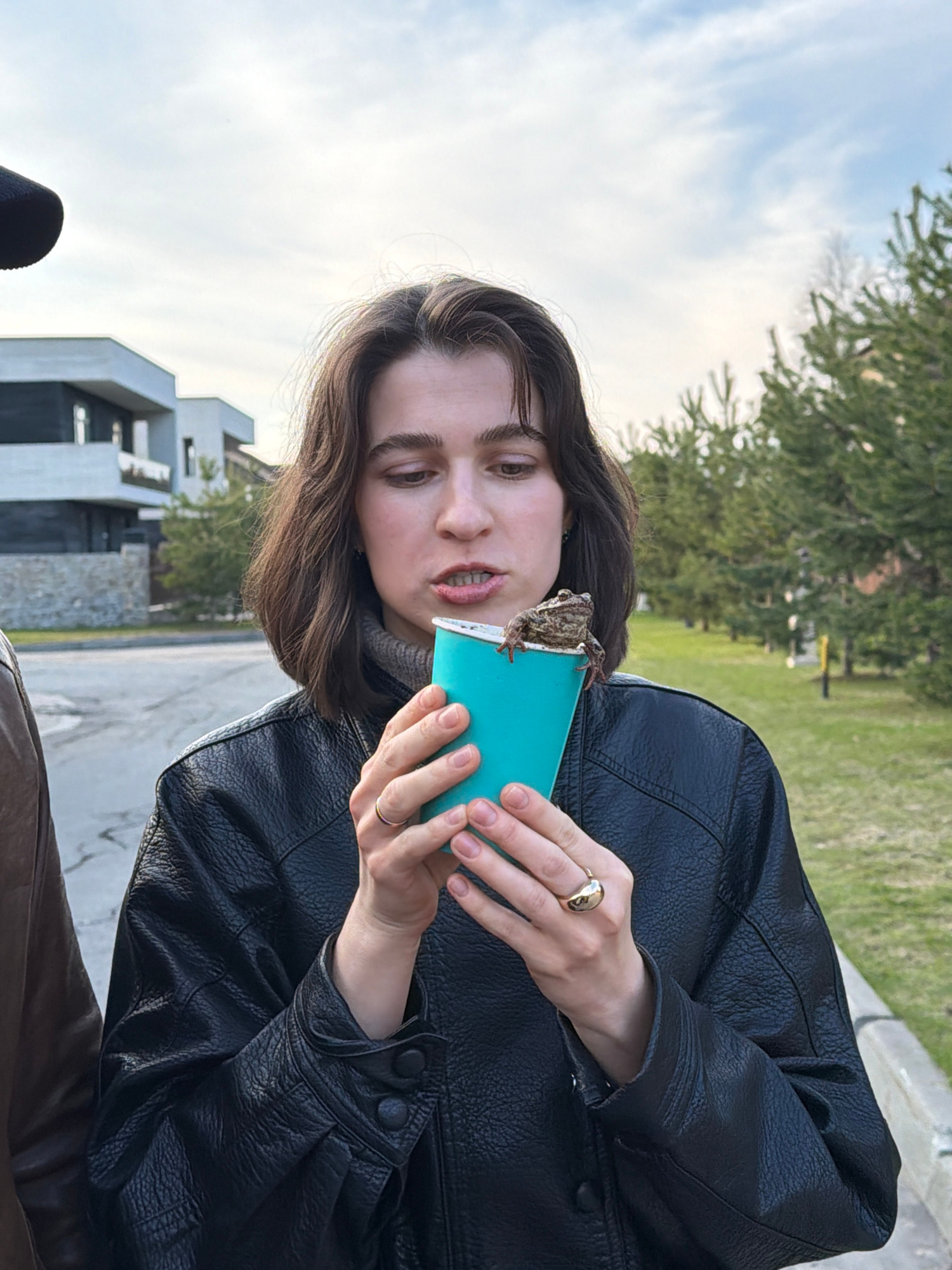 A woman stands outdoors holding a light blue cup with a frog perched on the rim near her mouth. She wears a black leather jacket and multiple rings on her fingers. The background includes a modern hou…read more