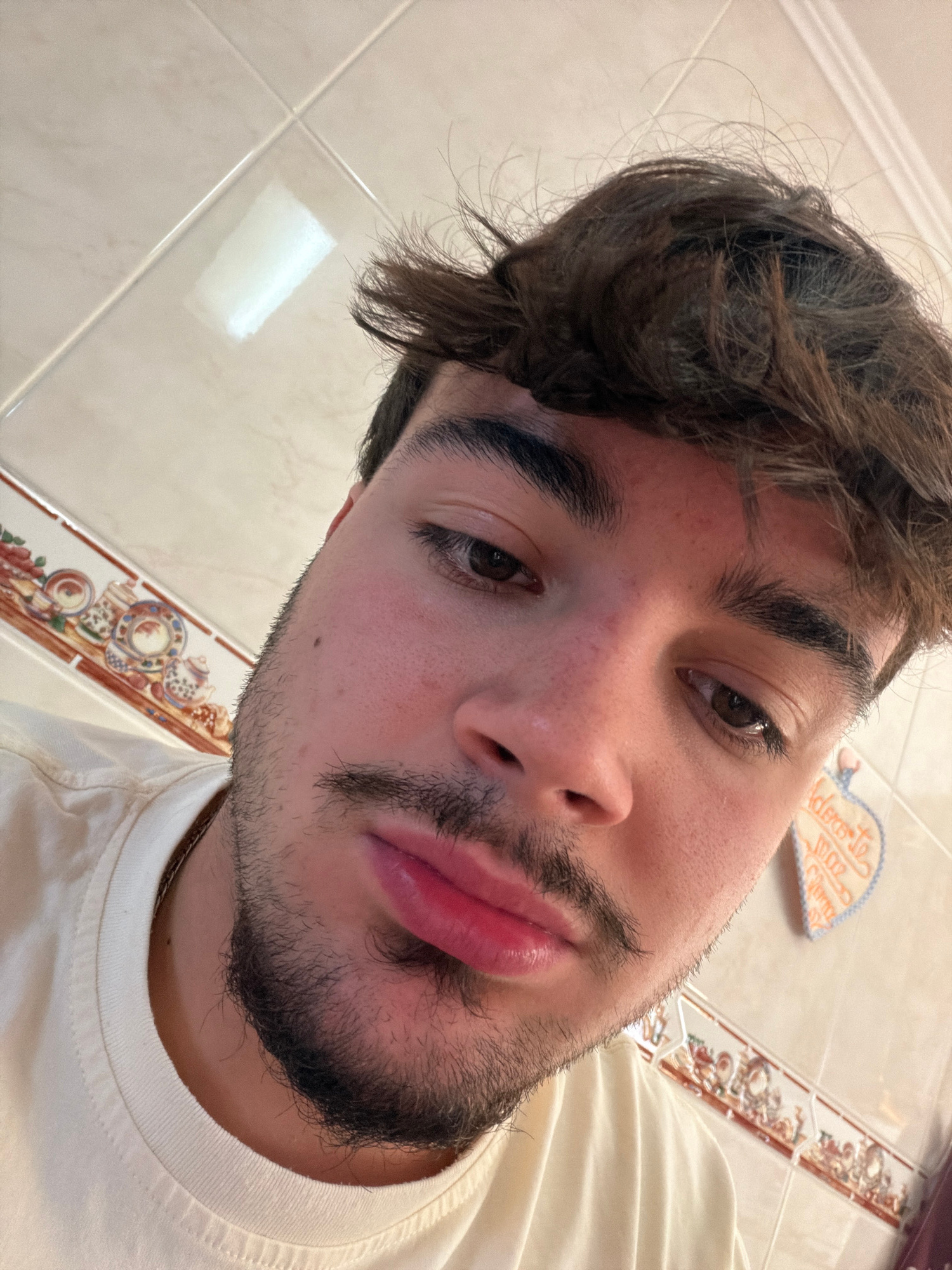 A close-up, selfie-style shot of a young man with dark hair and a beard. He is wearing a light-colored t-shirt. The background includes tiled surfaces and a decorative tile border with a floral patter…read more