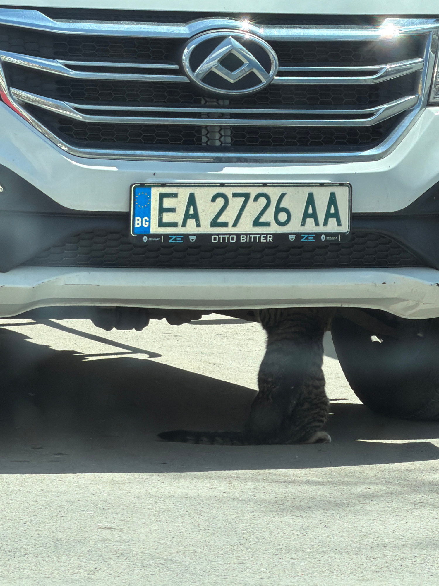 A gray tabby cat is partially visible under the front of a white car. The car's Bulgarian license plate reads "EA 2726 AA." The car's grill is visible, as is the Renault logo. "Otto Bitter" appears pr…read more