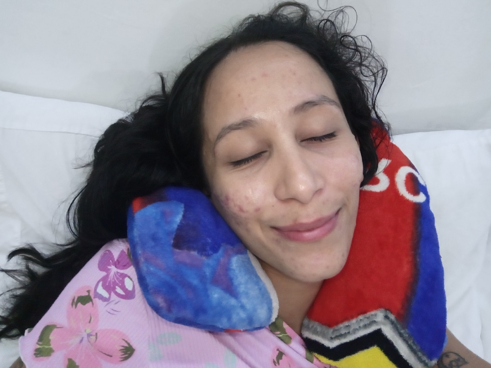 A woman with dark hair is lying down with her eyes closed and a slight smile. She is on a white pillow or bed. She is wearing a pink floral top and is resting her head on a colorful neck pillow with r…read more