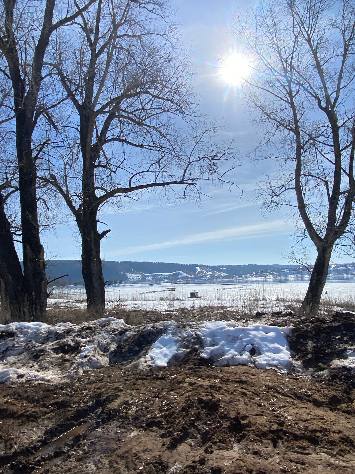 The image shows a winter landscape. In the foreground are bare tree branches against a bright blue sky with the sun shining through. A line of earth with patches of snow is visible on the right. In th…read more