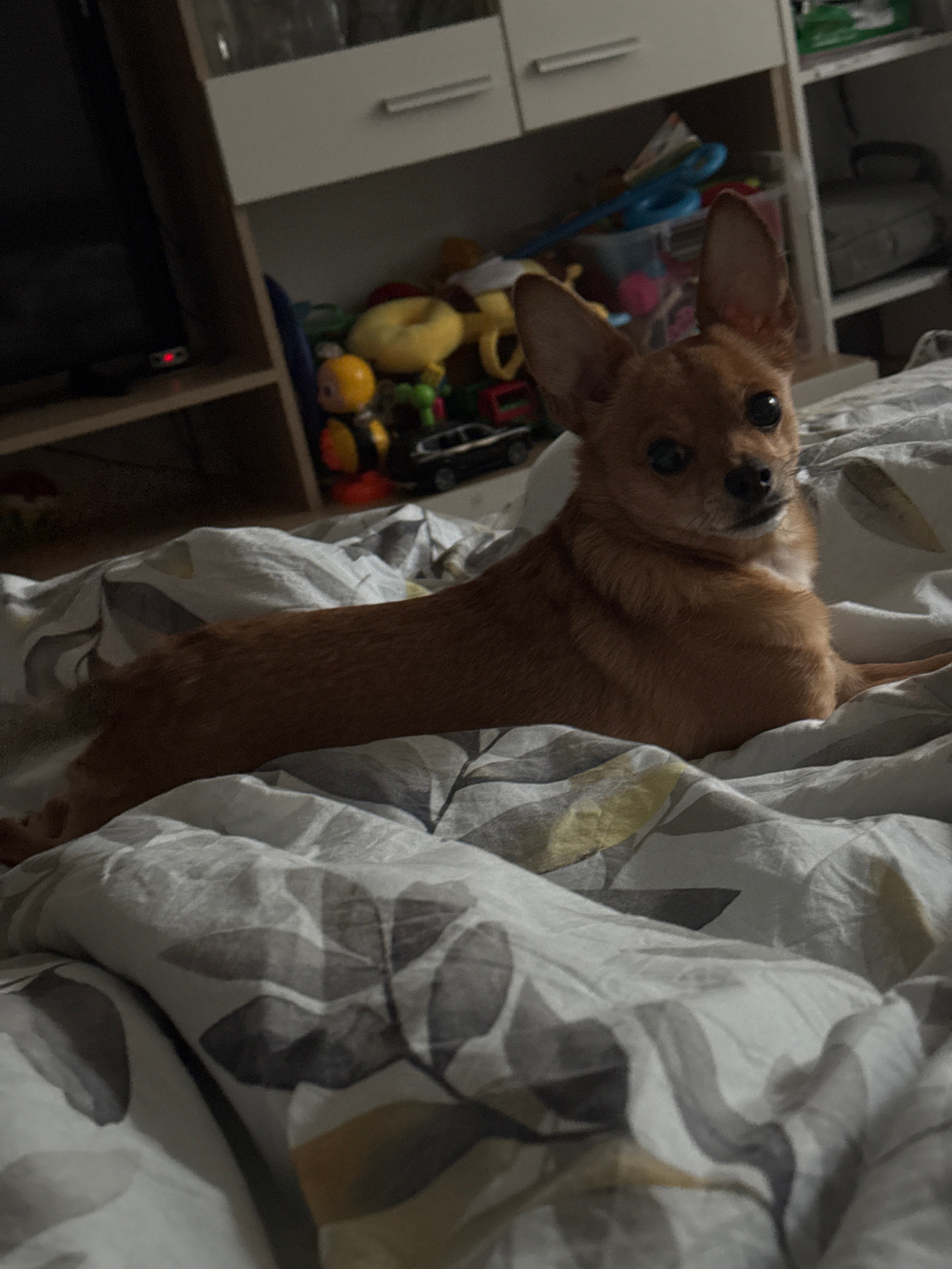A candid, tilted photograph captures a small, light brown dog peeking out from rumpled bedding in an indoor setting. The dog, with short fur, large dark eyes, and prominent ears, looks directly at the…read more