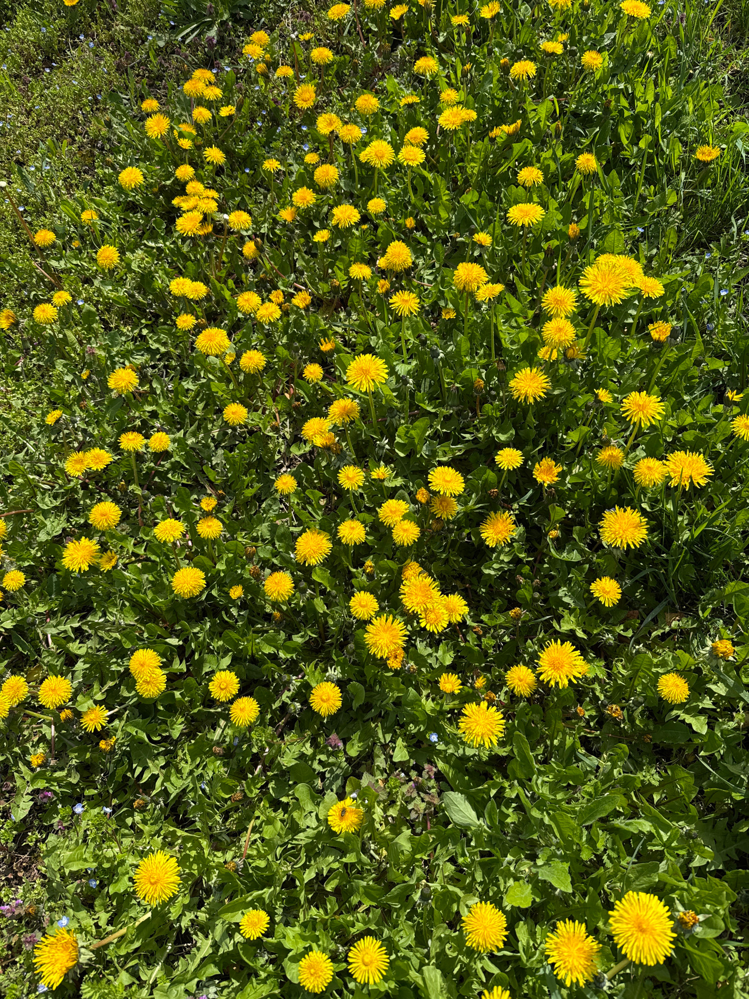 The image shows a field of dandelions in full bloom. The location appears to be outdoors, in a grassy area, potentially a park or garden. The dandelions are densely packed and interspersed with green…read more