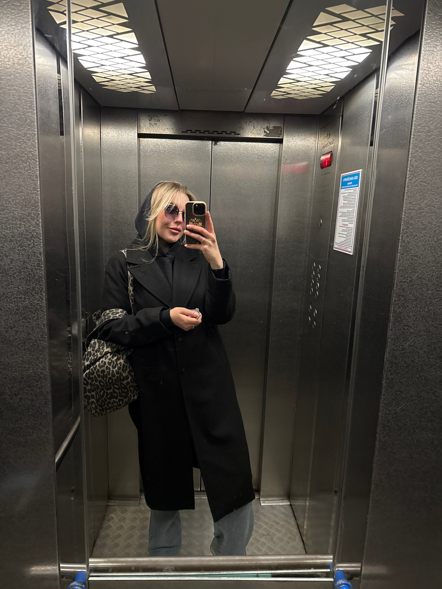 The image shows a young woman taking a mirror selfie inside an elevator. She is positioned centrally in the metallic elevator car, holding a smartphone to capture her reflection. The woman has blonde…read more