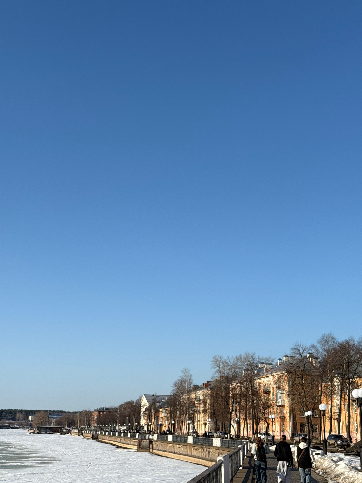 The image depicts a winter scene in Votkinsk, Russia. The sky is clear and blue. A partially frozen body of water is on the right side of the image. A paved promenade runs along the water’s edge, sepa…read more