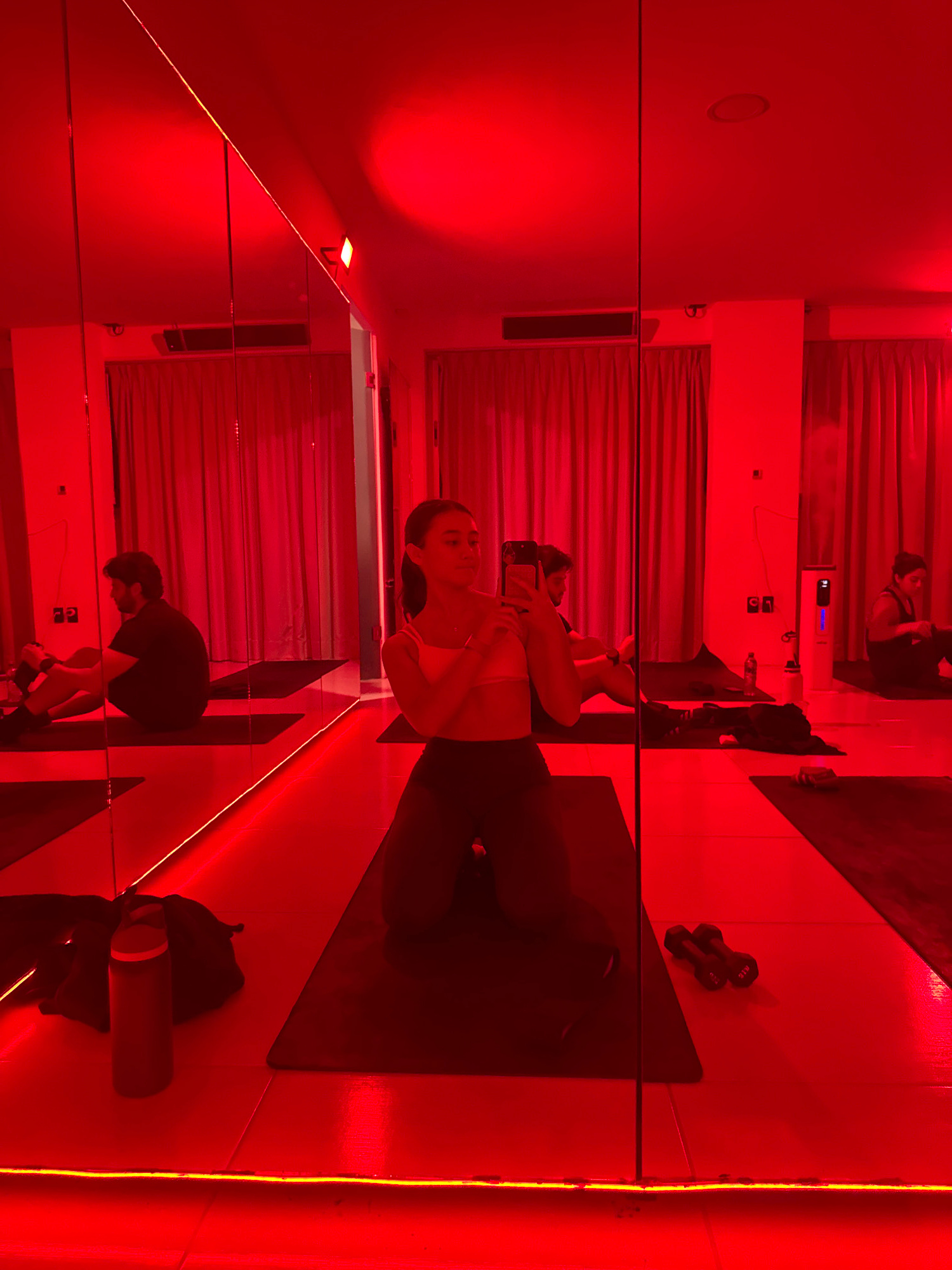 The photograph shows an indoor gym with red lighting, reflected in a wall of mirrors. A woman in a light-colored sports bra and dark leggings is seated on a dark yoga mat, holding a phone in her left…read more