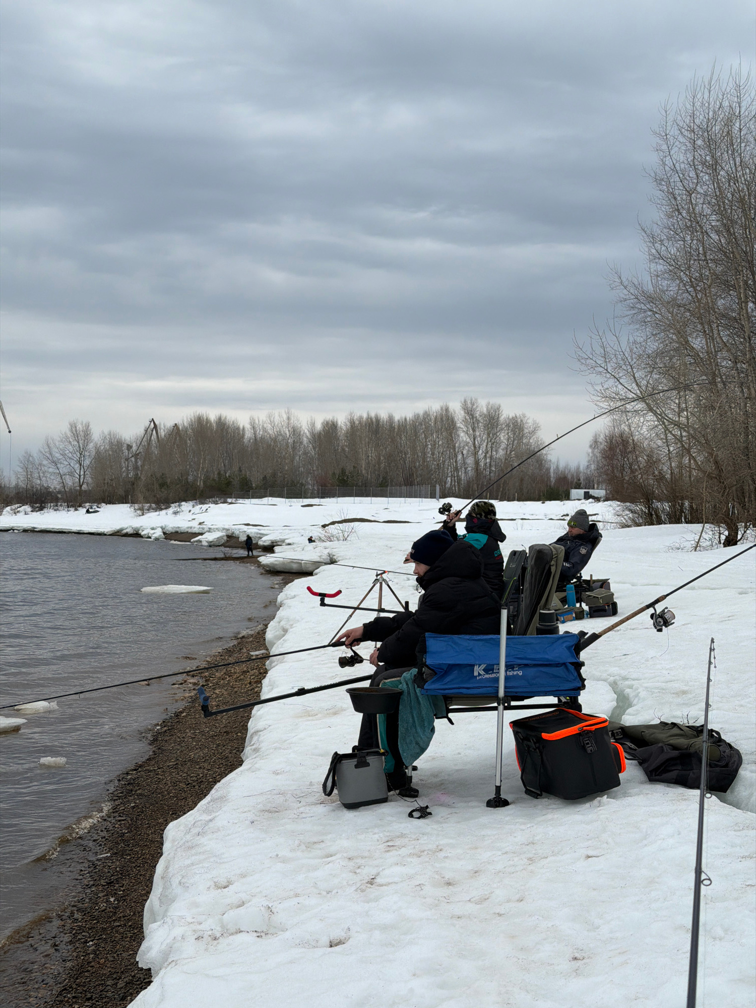 The image depicts three individuals fishing along the icy edge of a riverbank. The location is suggested to be Noviy, Russia. Patches of snow cover the ground around them, extending to the river's edg…read more