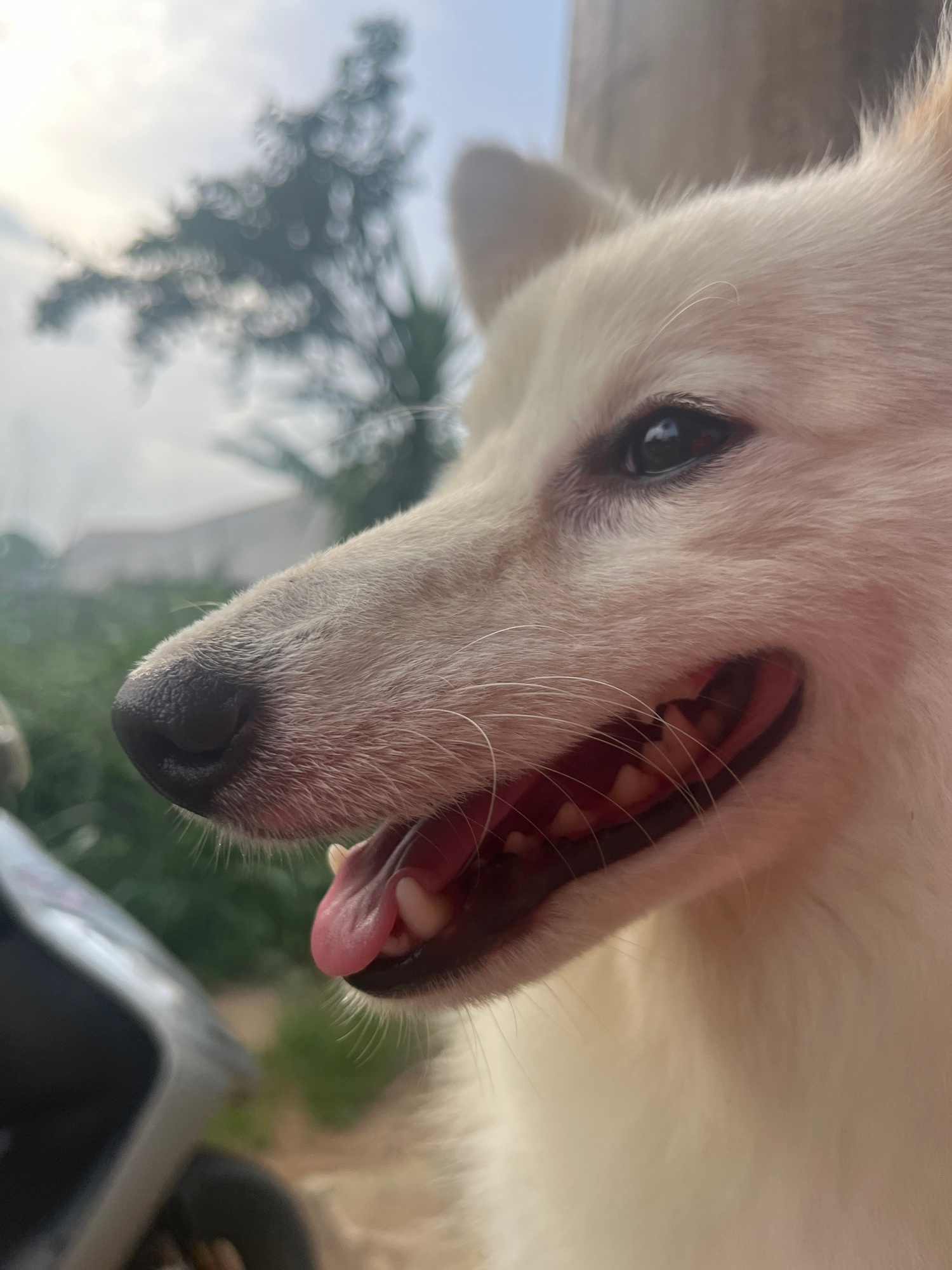 A close-up, tilted view of a white dog's face, showing its eye, nose, open mouth with tongue protruding, and teeth. In the background are blurred trees and a partial view of an object, potentially parβ¦read more