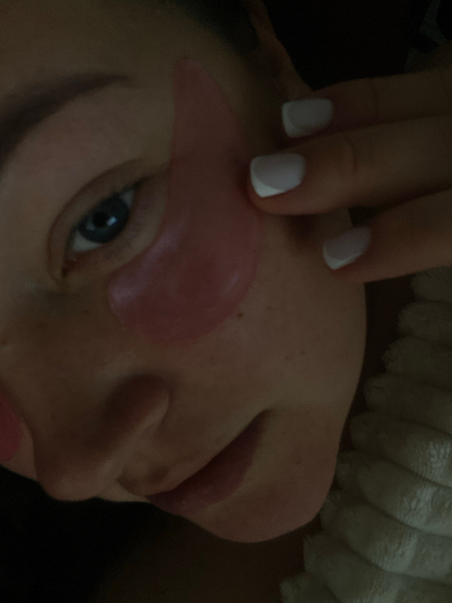 Close-up of a person's face with a pink under-eye patch, fingers with white-tipped nails touching the forehead, and a textured white fabric near the head. It is not possible to determine the location…read more