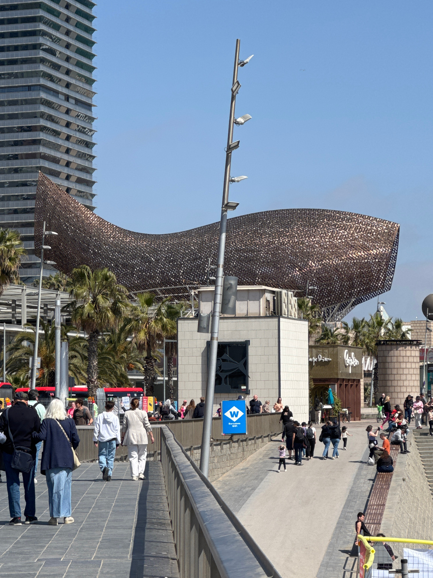 The image captures a sunny day in Barcelona, Spain. A large, modern sculpture resembling a fish, made of metallic scales, dominates the scene. It stands near the beach, as indicated by the presence of…read more